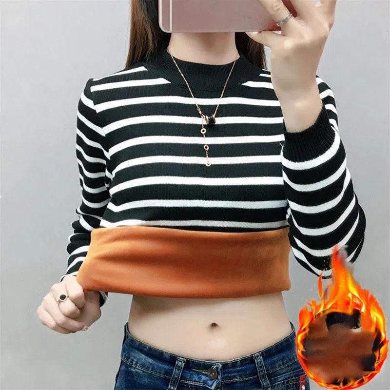 Плюс бархатная толстая золотая бархатная нижняя рубашка с полуводолазкой, женская осенне-зимняя одежда, тонкий полосатый топ с длинными рукавами, женская элегантная одежда