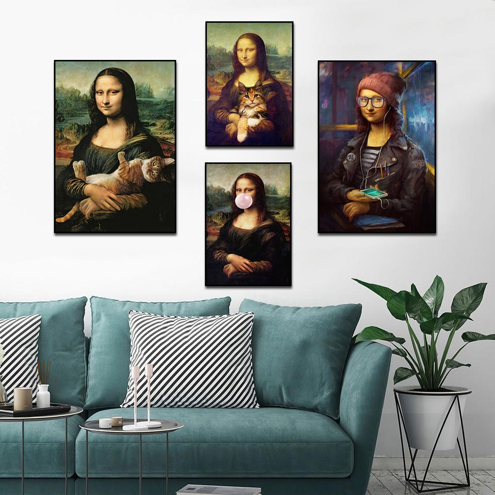 Винтажная Мона Лиза с котом, холст, картина, забавные постеры и принты, настенные художественные фотографии для гостиной, украшения дома, Cuadros
