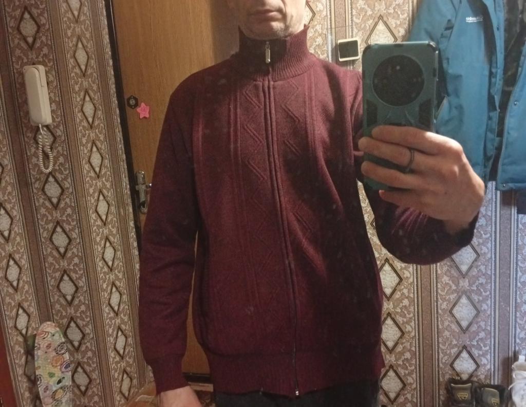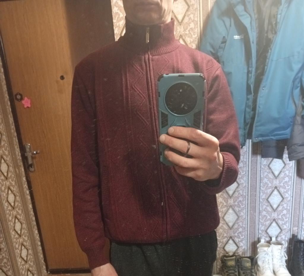 Размер подошёл идеально(рост 178см,вес 60кг),но есть одно но,низ свитера не ровный,на поясе неплотно прилегает, материал приятный на ощупь, внутренний материал похож на флис, вообще так свитер тёпленький,покупкой доволен.