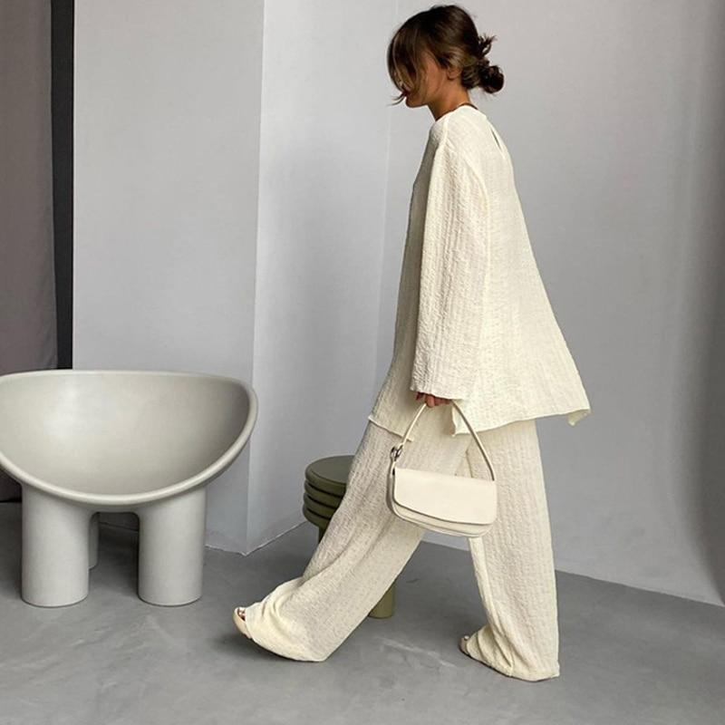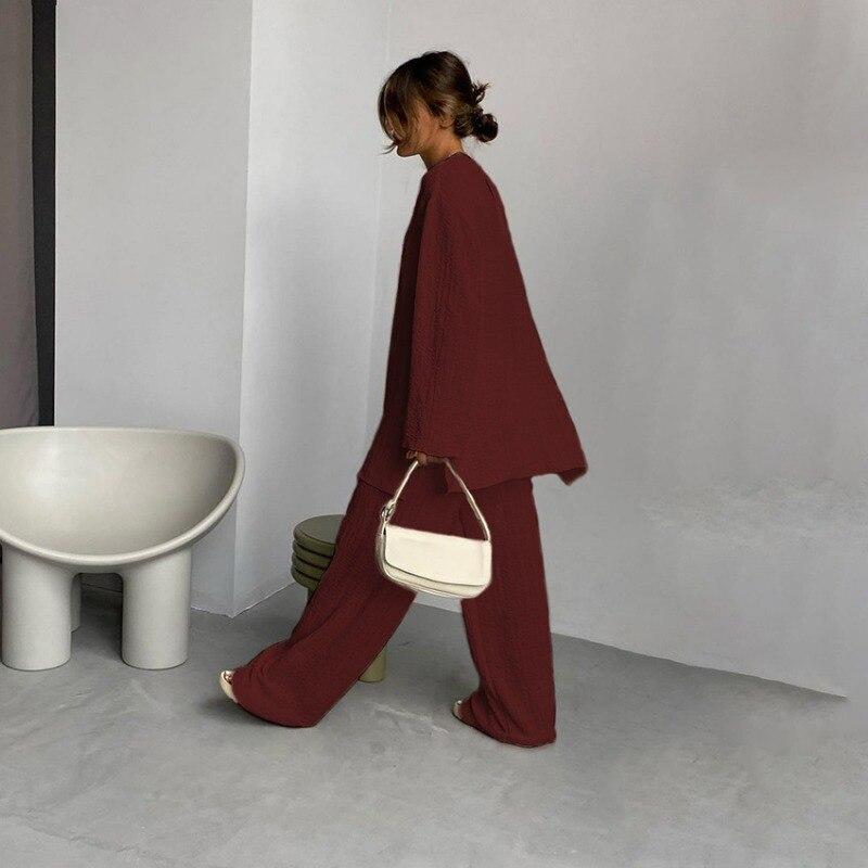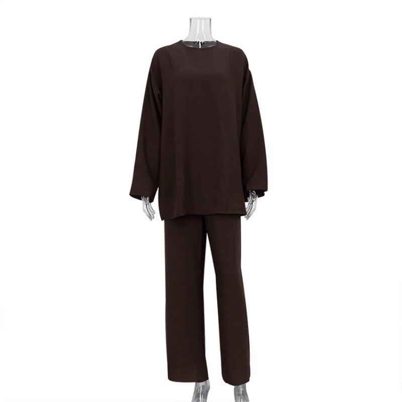 2023 Повседневная креповая блузка с длинным рукавом Женские длинные брюки 2 комплекта из двух предметов с круглым вырезом и разрезом Простые топы Свободные брюки Костюмы 28162