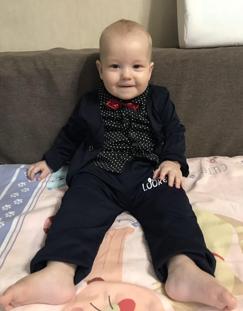 Купили на вырост, надо отпарить, смотрится хорошо. Синтетика, поэтому не для жары определенно. Нам 8 месяцев, 76см и 11 кг, осталось недолго расти до костюма: не думаю, что на ростовку 90, подогнула рукава и штанины сантиметров на 5