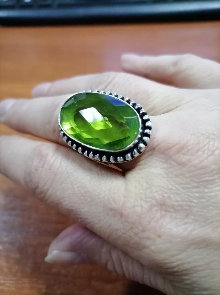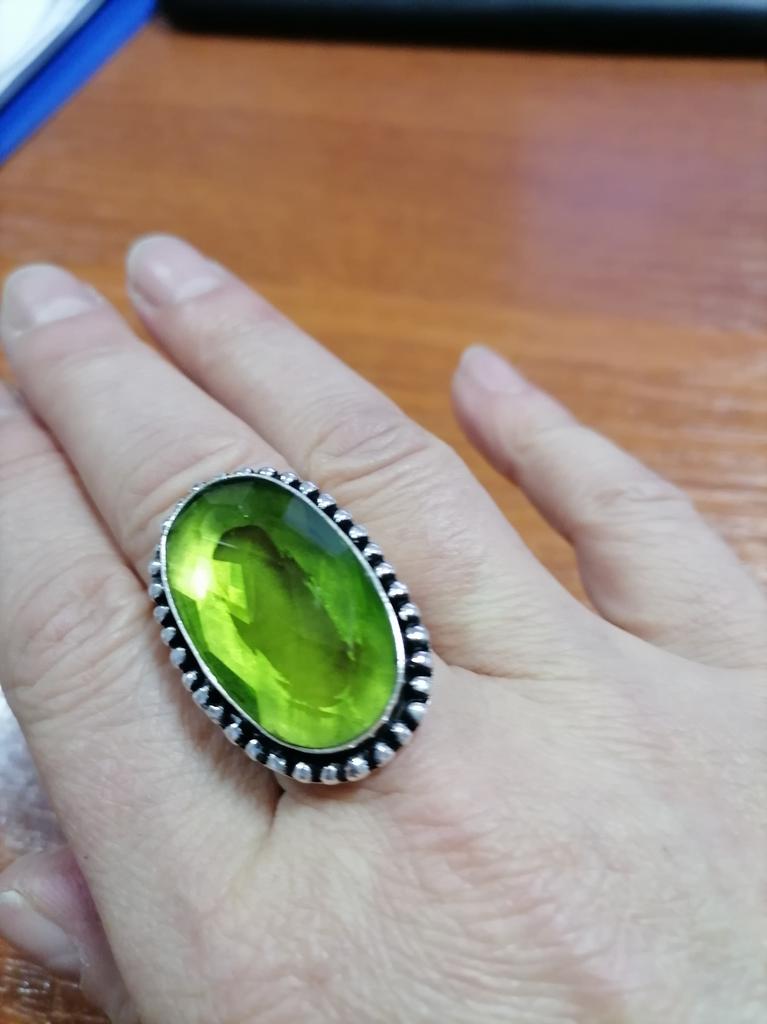 Кольцо с масивным камнем почти с фалангу пальца. Смотрится очень красиво. Заявлено, как серебряное с перидотом, на ободке стоит проба. Сертификата в отправлении нет. Благодарю мастера за изготовление. Благодарю команду Джум за быструю доставку.