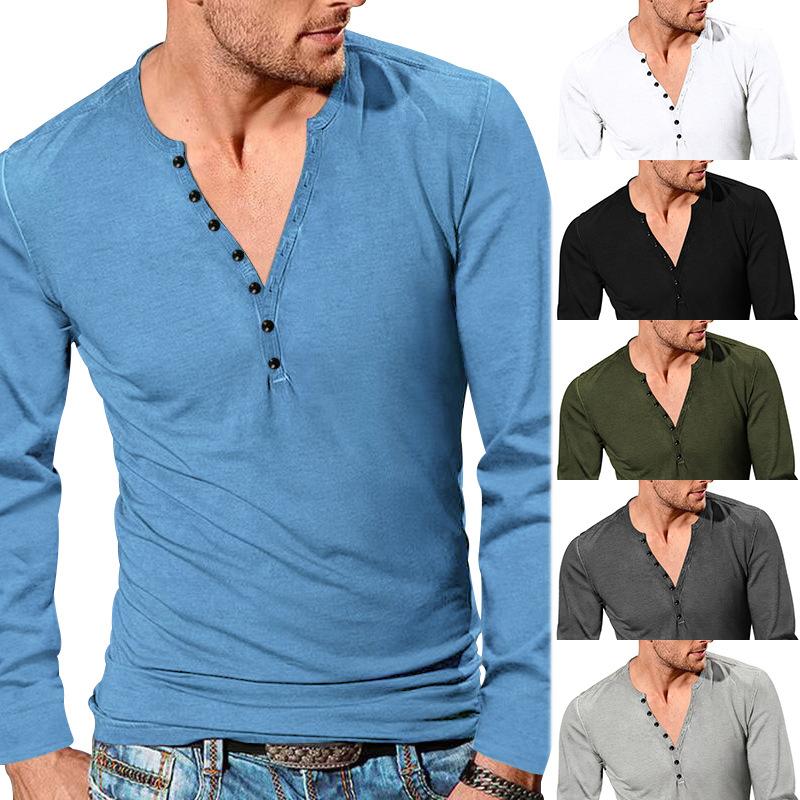 Мужская однотонная осенняя футболка с карманом на пуговицах и v-образным вырезом, мужские белые, черные базовые топы, футболки с длинными рукавами