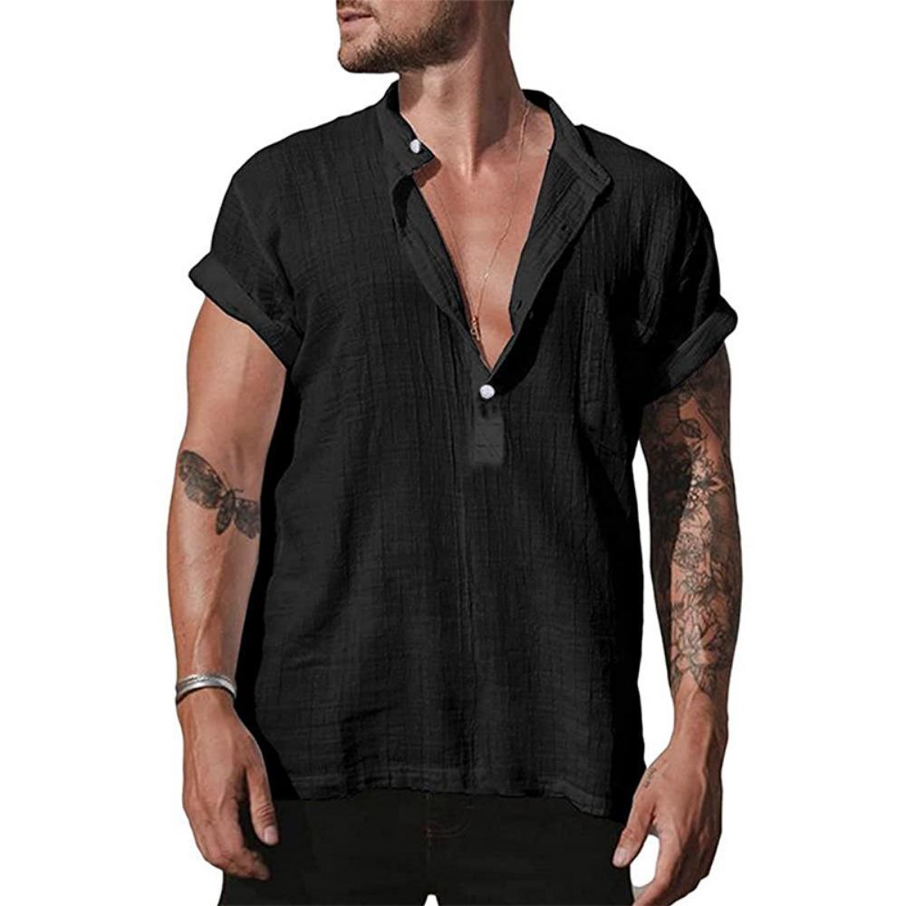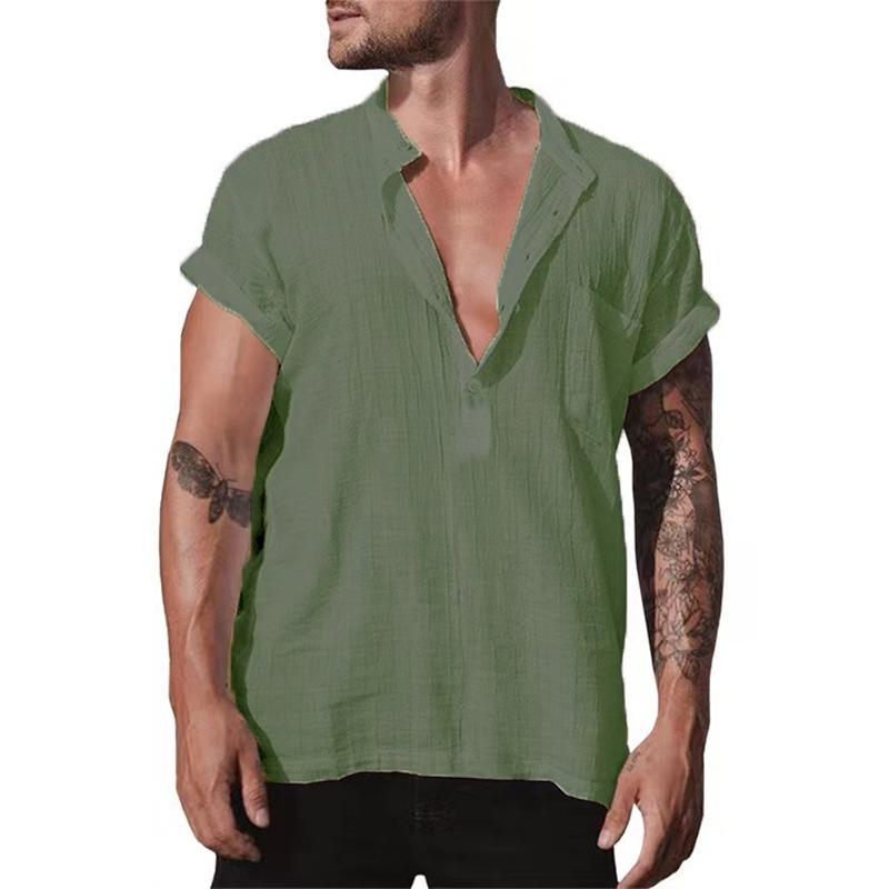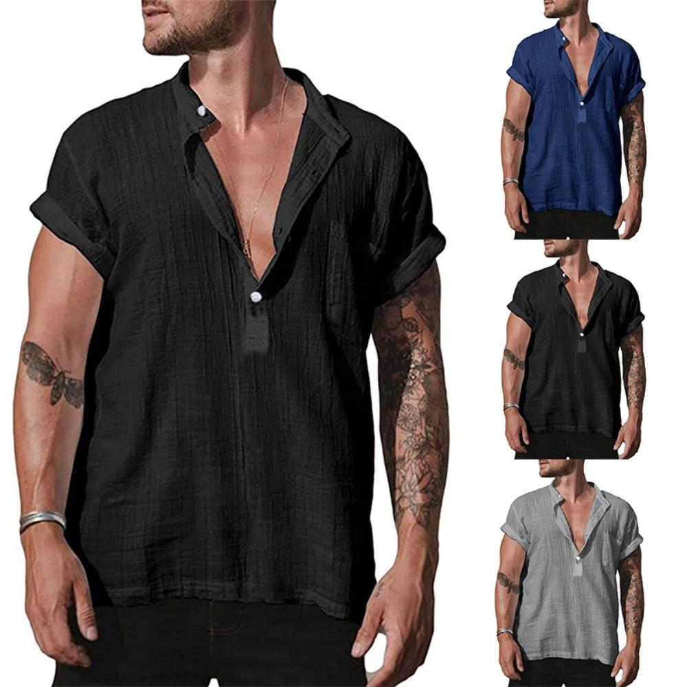 Мужские льняные рубашки с коротким рукавом на пуговицах и воротником-стойкой, повседневные рубашки, летние домашние повседневные рубашки