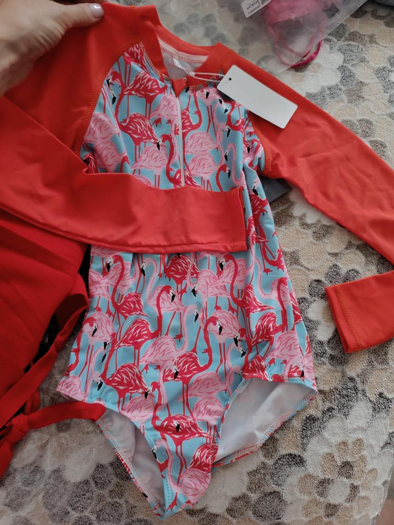 Ткань купальника очень хорошая, жаль, что немного большой, но оставим на вырост.будем надеяться, что цвет в бассейне не потеряет. Продавец порадовал - в подарок положили сережки в цвет купальника.