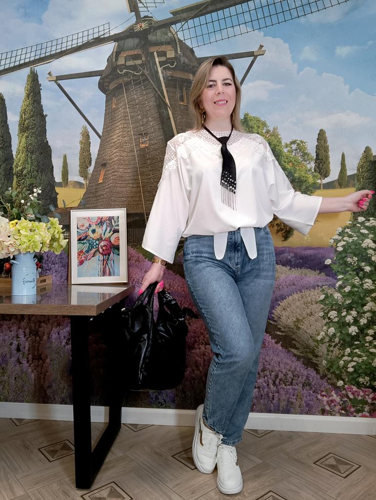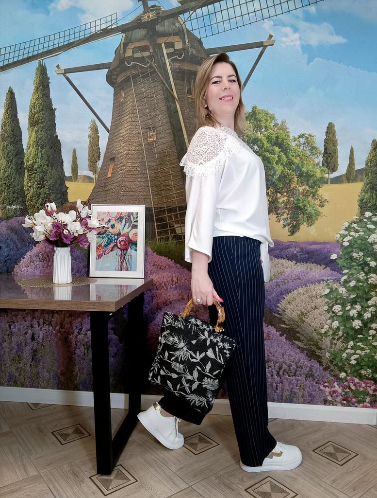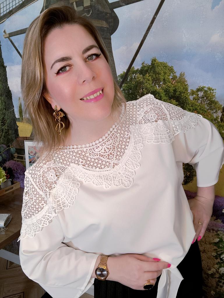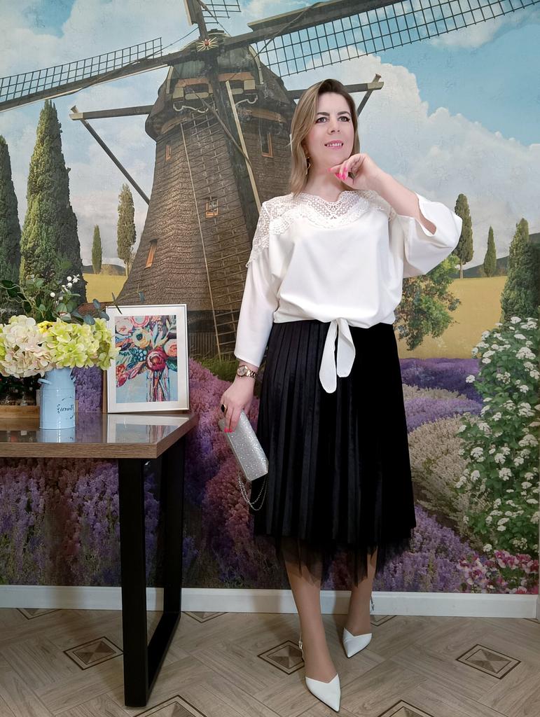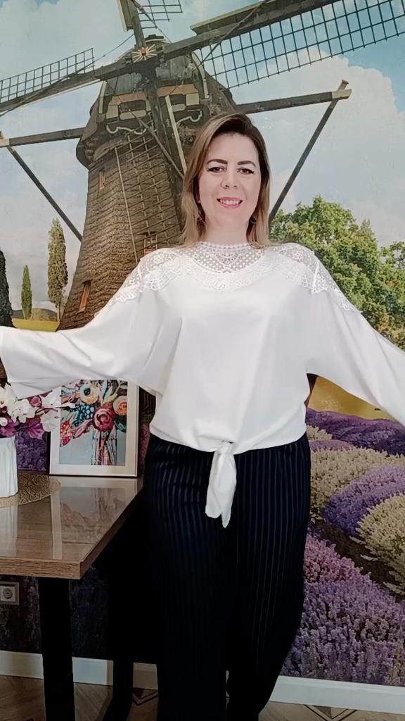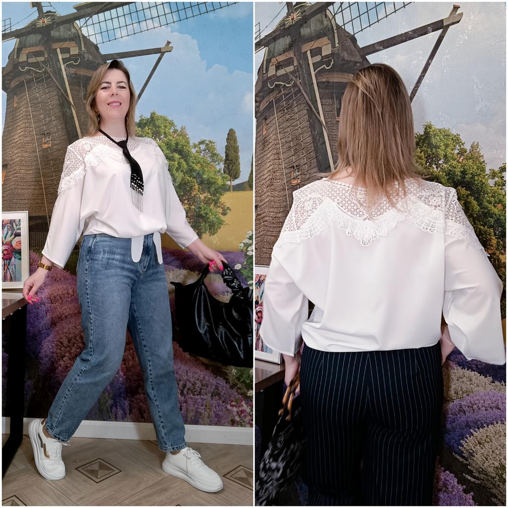 НАРЯДНАЯ БЛУЗА С КРУЖЕВОМ Очень удачный крой! Привет 👋 Сегодня смотрим с вами прекрасный вариант нарядной блузы. Праздничной. С красивым кружевом. Она лёгкая, воздушная и очень комфортная. Сразу скажу - идеальный вариант для размеров Плюс сайз! Понятно, что на стройняшках тоже смотрится отлично) но, Плюсики, обратите внимание 😉 Вся красота расположена в верхней части. От плеча до плеча словно широкой накидкой идёт лёгкое воздушное кружево. Оно играет здесь главную скрипку. Смотрится нарядно, благородно, чуть кокетливо, но достойно. Рукава три четверти, широкие, форма "летучая мышь" Все самые пухлые части отлично замаскированы) И особое внимание хочу обратить на низ блузы. Спереди сделаны две длинные ленты, которые заказываешь,как рубашку. Это крутая идея для таких блузок из скользящего материала, потому что это вечная проблема: заправить их так, чтобы не выбивалась. А тут завязываешь под свои размеры и готово. Смотрится красиво и без конца поправлять не нужно. Такой приём ещё удачно скрывает животик 😉 При желанит, торчащие завязки можно подогнуть внутрь. Блуза лёгкая, нежная и приятная к телу. Материал полиэстер, но не противный. Не электризуется. Почти не тянется Пошив фабричный, без нареканий. Отлично смотрится хоть с брюками, хоть с юбками, хоть с джинсами. На выбор две расцветки 🤍🖤 Размеры: M - XXL. Я взяла белую в максимальном размере. Мой рост 173см. ОГ 98см. ОТ 89см. ОБ 110см Размер одежды 50 -52 Замеры в размере XXL: 📏длина 63см 📏плечи 46см 📏длина рукава 45см 📏обхват рукава 46см 📏ОГ 120см 📏ОТ 116см 📏Низ 116см Прекрасный вариант нарядной блузы. И в пир, и в мир! Понравилась. Рекомендую ✅ #elena_likui #блуза #женский_гардероб