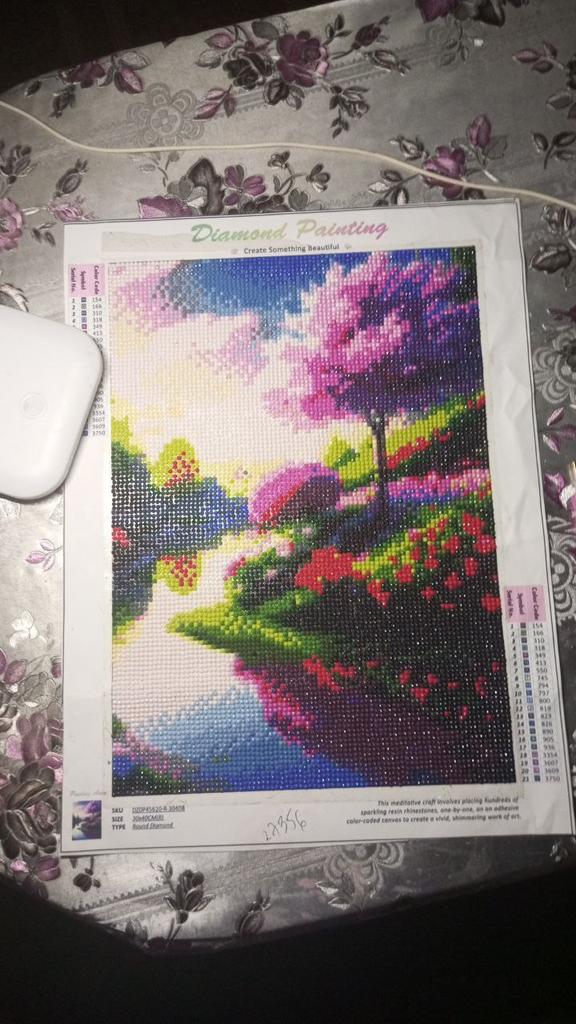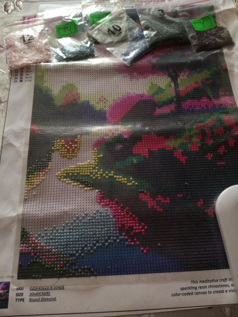 Хорошая картина,отдала маме,. Она уже её собирает и довольная.Картина не такая яркая пока как на примере,но красиво.Как и написано в некоторых отзывах не хватило страз,либо было очень в притык.За такие деньги не очень приятно.У нас есть от других стразы,но не приятно.