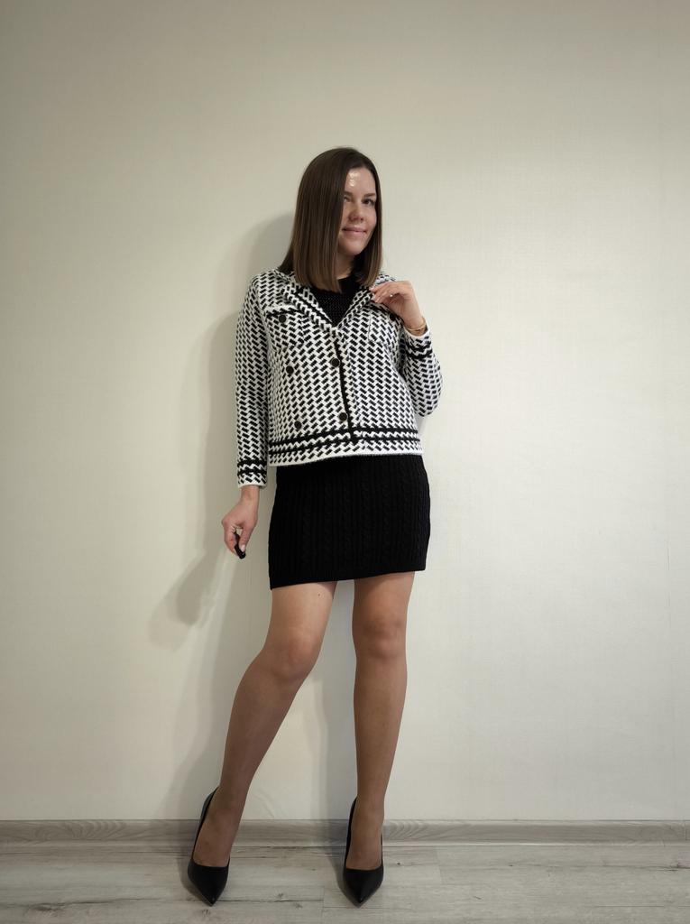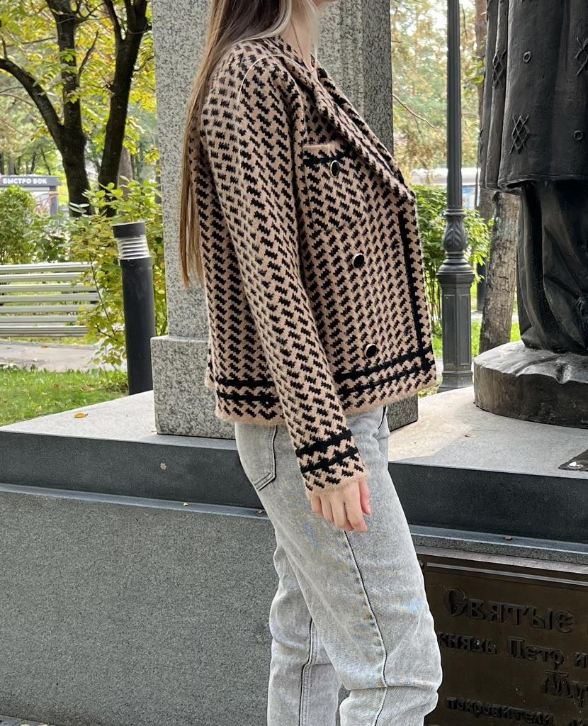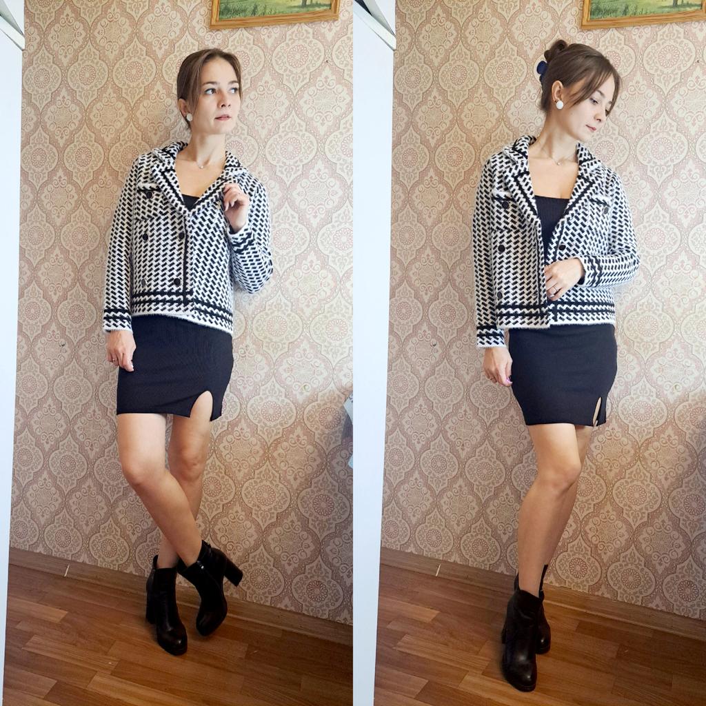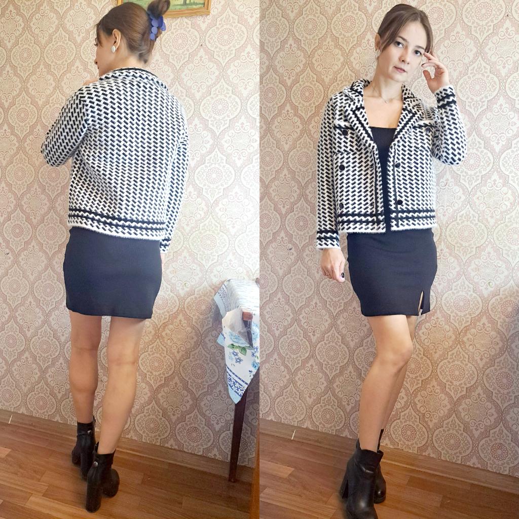 Кардиган 🖤 Теплый кардиган, выполненный в стиле жакета с воротником. 💫 Принт отдаленно напоминает гусиную лапку, но вблизи это ёлочка. Жакет-кардиган плотный, двубортный, застёгивается на пуговицы в золотой оправе. Длина чуть короче стандартной, это касается и рукавов. Нагрудный кармашек, не обманка. Имеет пушистую фактуру, очень похож на материал пальто, в недавнем обзоре. 💯 Очень теплый, на работе даже было жарко, поняла что в помещении нужно под него лёгкий топ вместо водолазки) Качественная вещь на холодный сезон. В деловом и повседневном гардеробе займет свое место 😊 У продавца есть также коричневый 🤎