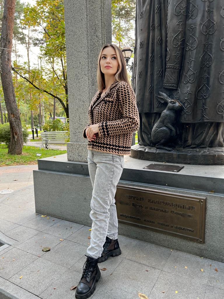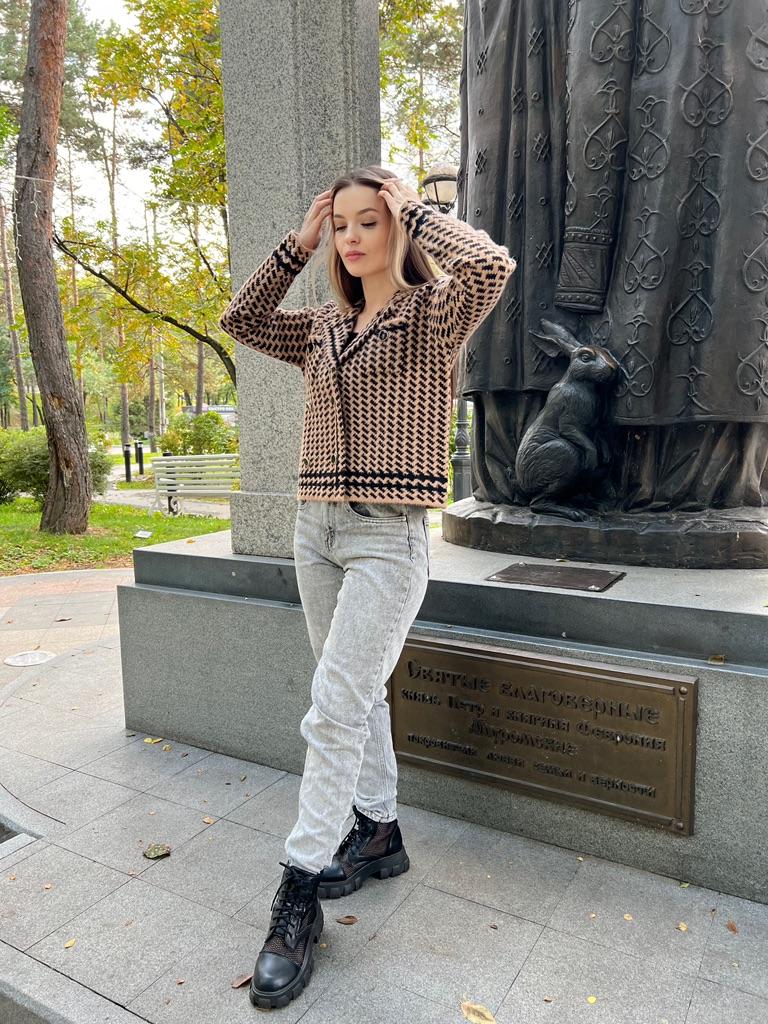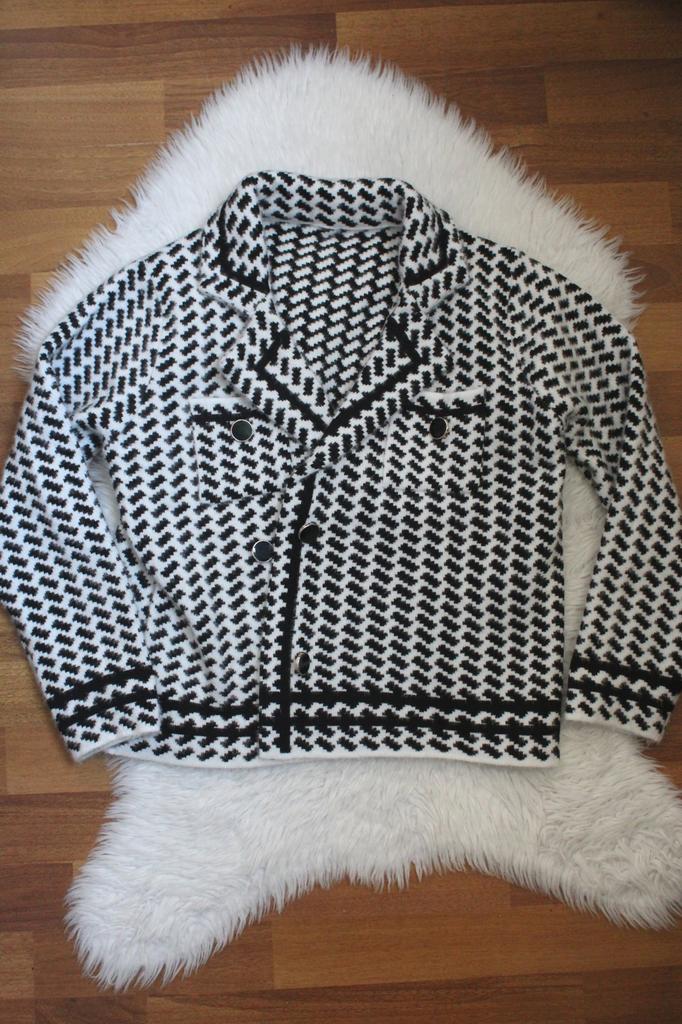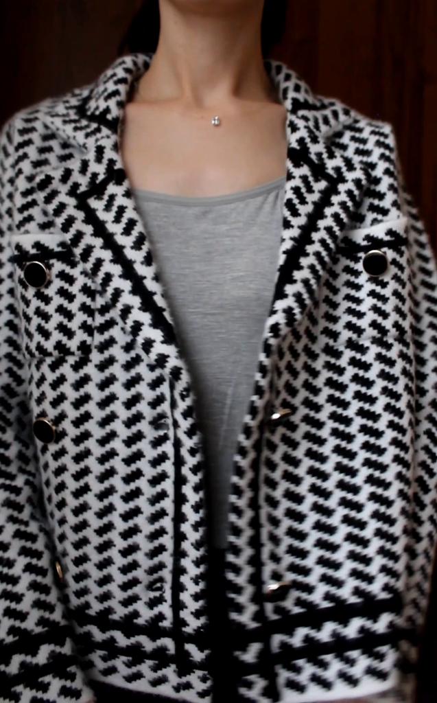 Кардиган 🖤 Теплый кардиган, выполненный в стиле жакета с воротником. 💫 Принт отдаленно напоминает гусиную лапку, но вблизи это ёлочка. Жакет-кардиган плотный, двубортный, застёгивается на пуговицы в золотой оправе. Длина чуть короче стандартной, это касается и рукавов. Нагрудный кармашек, не обманка. Имеет пушистую фактуру, очень похож на материал пальто, в недавнем обзоре. 💯 Очень теплый, на работе даже было жарко, поняла что в помещении нужно под него лёгкий топ вместо водолазки) Качественная вещь на холодный сезон. В деловом и повседневном гардеробе займет свое место 😊 У продавца есть также коричневый 🤎