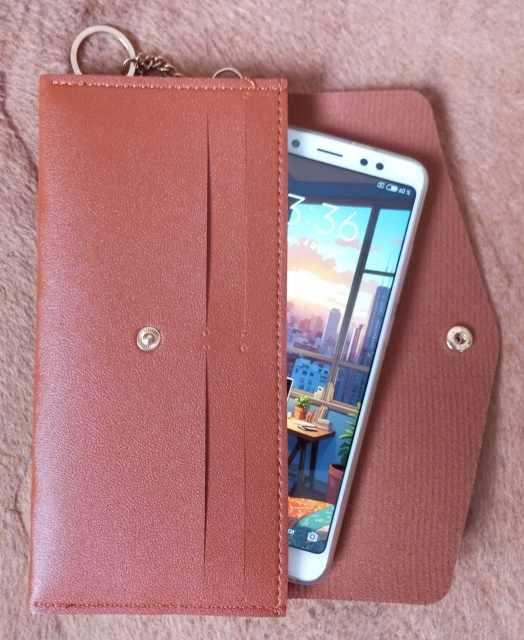 Кошелёк выглядит симпатично и приятен на ощупь. Выполнен очень аккуратно (фото 1). Имеет 3 отделения: среднее маленькое и два крайних побольше. В одно из них можно положить телефон (в бампере) с размерами высота/ширина/глубина 158.5/75.45/8 мм, входит замечательно (фото 3). На фото 2 для сравнения показан телефон Xiaomi Redmi Note 13, имеющий размеры 162.24/75.55/7.97. Чисто визуально кажется, что тоже должен легко помещаться. На самом же деле впихнуть можно, но с трудом. Если же ваш телефон меньше, то покупайте смело. Фото 4 - упаковка.