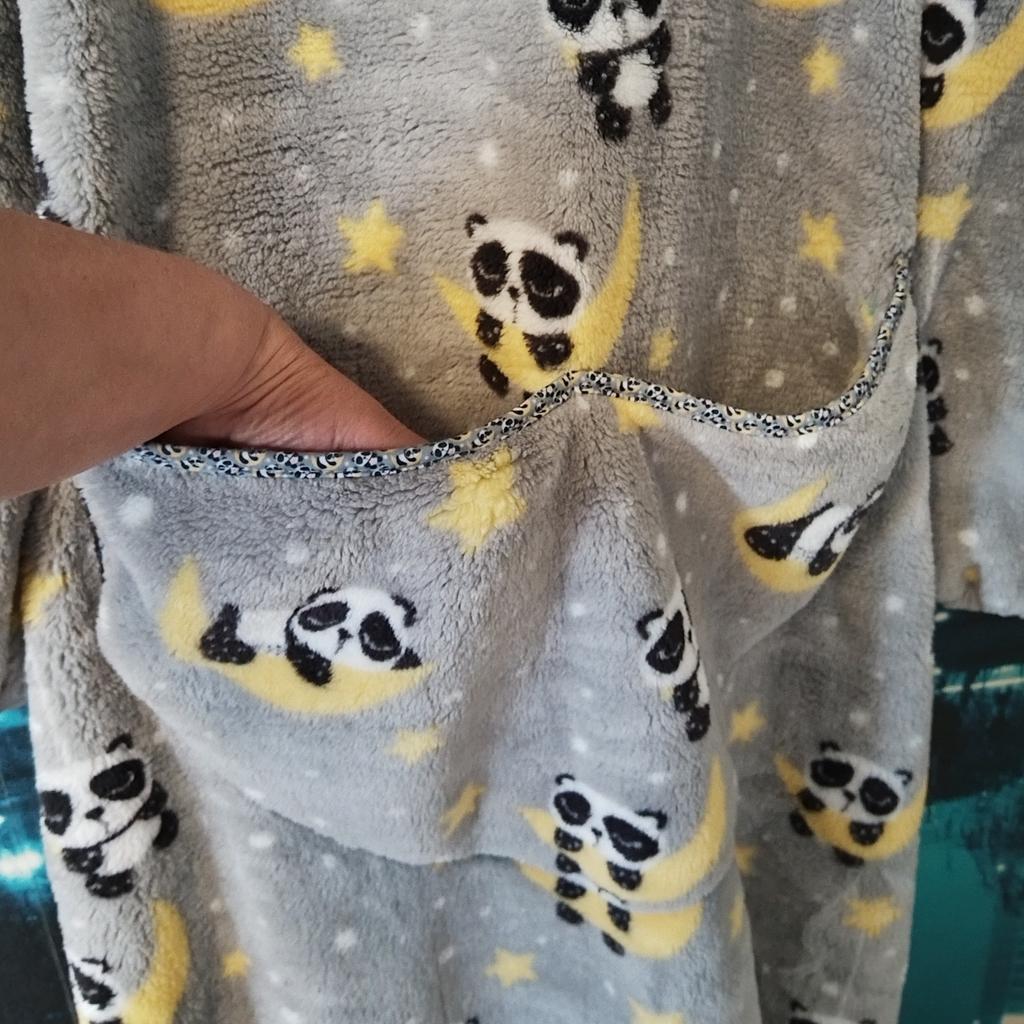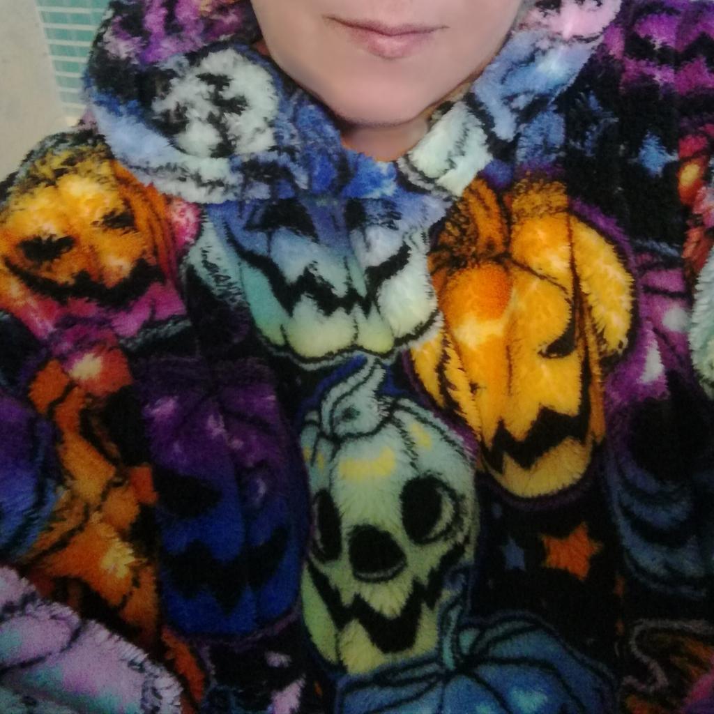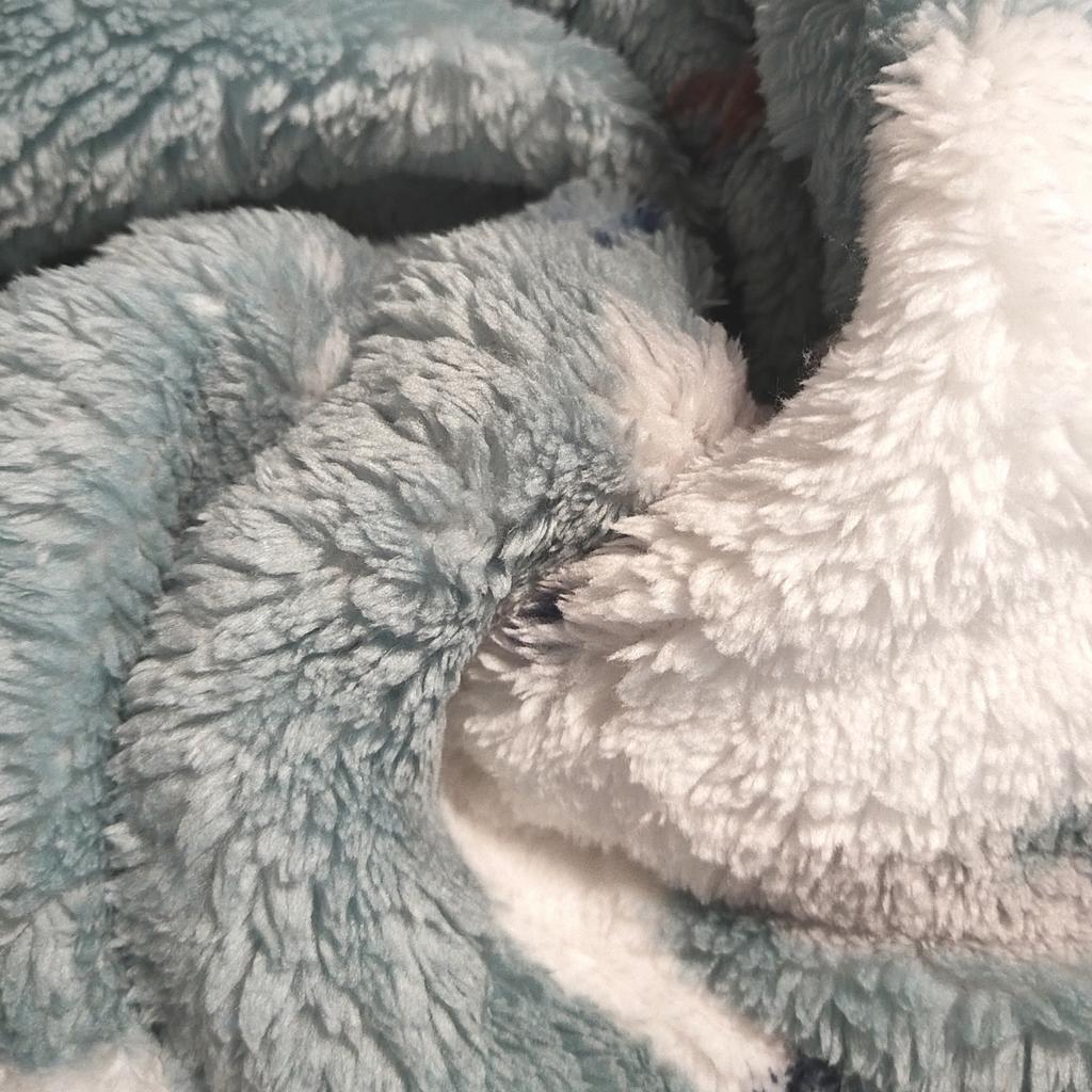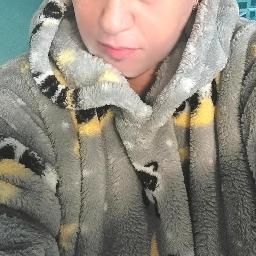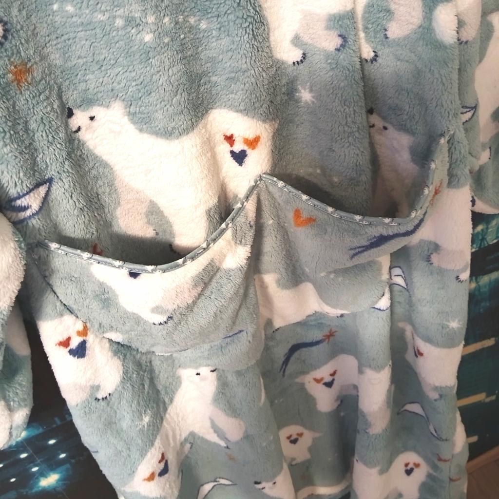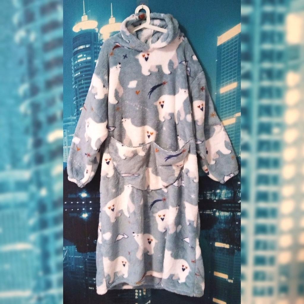 Супер-штука! У меня с белыми медведями - цвет не серо-голубой, как у продавца, а скорее немного мятный, но очень красивый! Рисунок довольно чёткий, как на фото, ткань - мохнатенькая "мякушка", на бирке состав указан 100% полиэстер, но не знаю так ли - очень приятный к телу, уютный, тёплый, довольно плотненький. Замеры таблицы продавца соответствуют: плечи 70 см, обхват груди 160 см, обхват по подолу 180 см, длина рукава около 65 см, длина от плеча до подола 140 см, капюшон полноценный, как на промофото с двумя швами по голове, в манжетах рукавов резинки, спереди большой карман. На рост 162 см длина почти до ступни, ниже щиколотки - классно! Запаха нет, был упакован в вакуумный пакет (ещё удивилась, что пакет не очень большой и довольно тяжёлый, а оказалось, что выпущен воздух из пакета), сверху пакет-пупырка и тонкий почтовый пакет. Пойду, лягу на снег и прикинусь пингвином - очень тёплый и уютный халат-плед! Закажу ещё два - себе в другом цвете и сыну в какой-нибудь "агрессивной" расцветке, ему тоже понравился😁. Рекомендую!!!👍