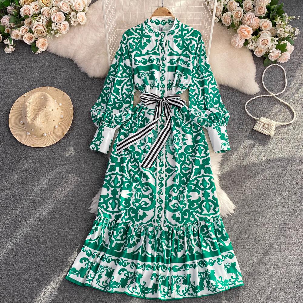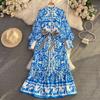 Осеннее модное богемное длинное макси-платье с геометрическим цветочным принтом, женское платье из поплина с воротником-фонариком и рукавами-фонариками на шнуровке, отпускные платья