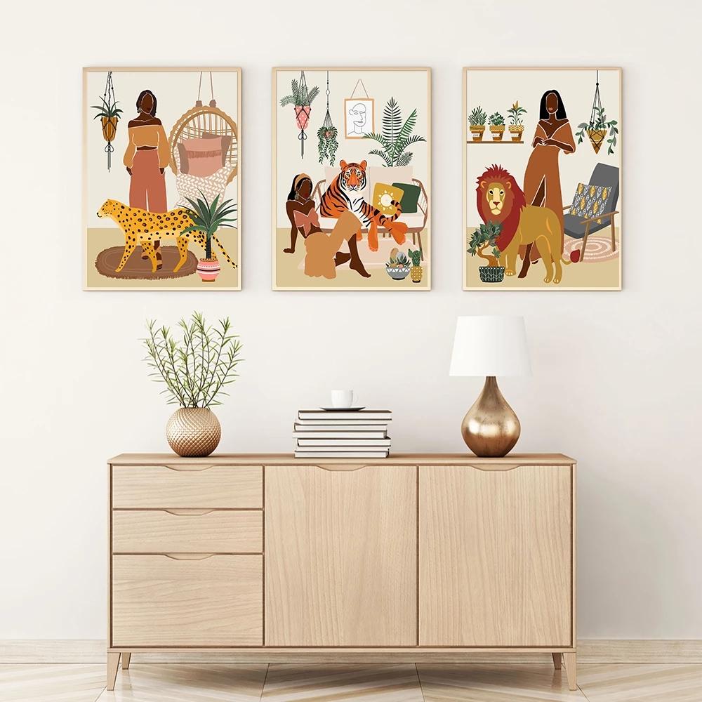 Рамка из цельного дерева Афро-Американский женский принт в стиле бохо Черная девушка Плакат Джунгли Леди Холст Картина Растение Animail Настенная картина Декор в гостиную