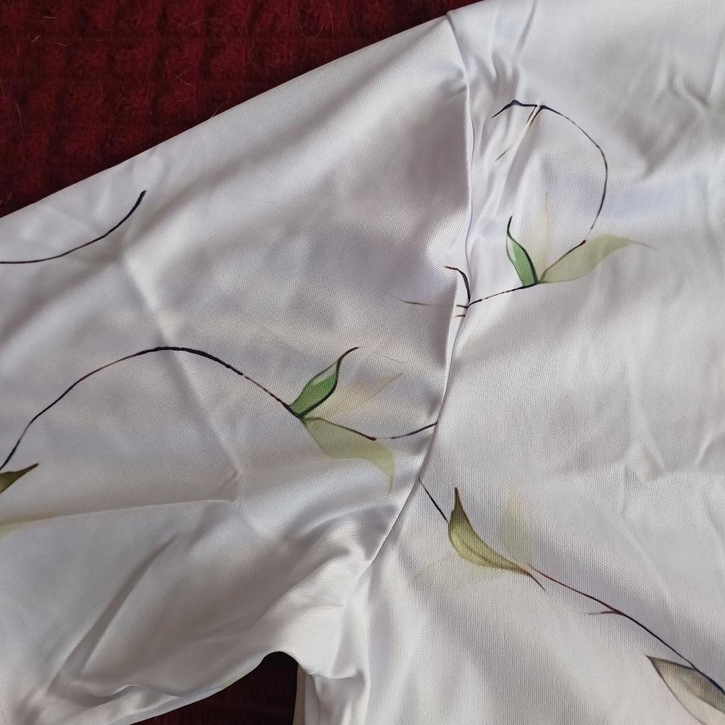 Пройма у рукавов пришита сикось-накось, из-за этого рукав "сдвинут" на спину и морщит. Пройма горловины пришита более узкой полоской, чем это указано на рекламном фото, почти впополам, что совершенно меняет внешний образ модели. Ткань синтетика без намека на присутствие хлопковой нити. В такой футболке в прохладный день и тёплый кардиган будет не нужен. Рисунок явно бледнее заявленного, или он таким и был, но над фото поколдовал фотошоп. Самое печальное ждало впереди: не соответствие размера. Заказала самый маленький, какой был, L. Сверила по меркам. Оказалось, напрасно. В эту майку можно смело засунуть двух таких, как я, с размером 46-48....Надо отдать должное, все швы добросовестно обработаны оверлоком. И на том спасибо. Но перешивать все эти косяки - дорого и хлопотно. Видимо, в корзину с мусором....:(
