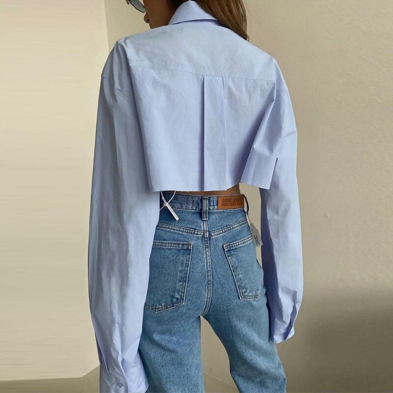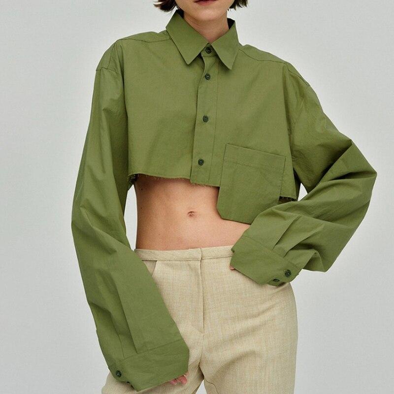 Белая рубашка женская 2023 осенняя мода асимметричные короткие топы с карманами пикантная блузка с открытым пупком повседневная одежда 28626