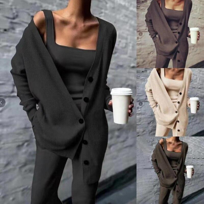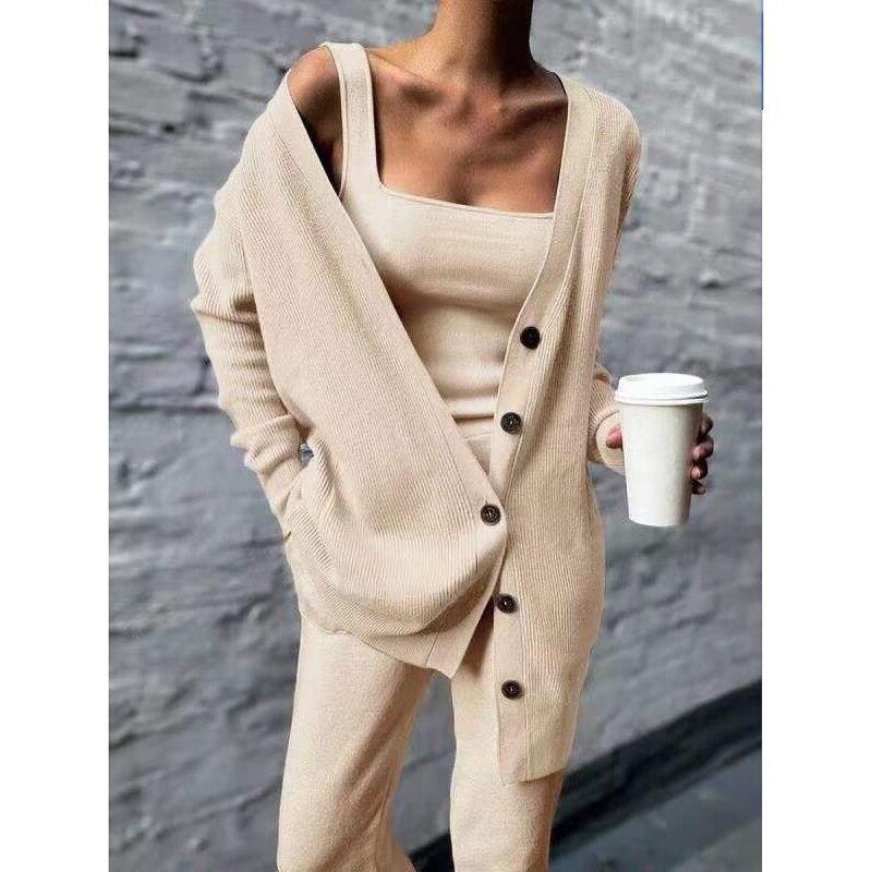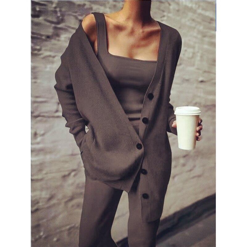 Вязаный комплект из трех предметов, жилет и длинные брюки, женский кардиган с v-образным вырезом, пальто, женская осень 2023, майка, свободные брюки, наряды 28657