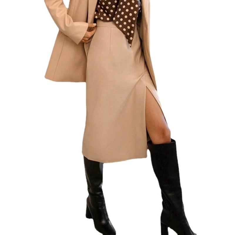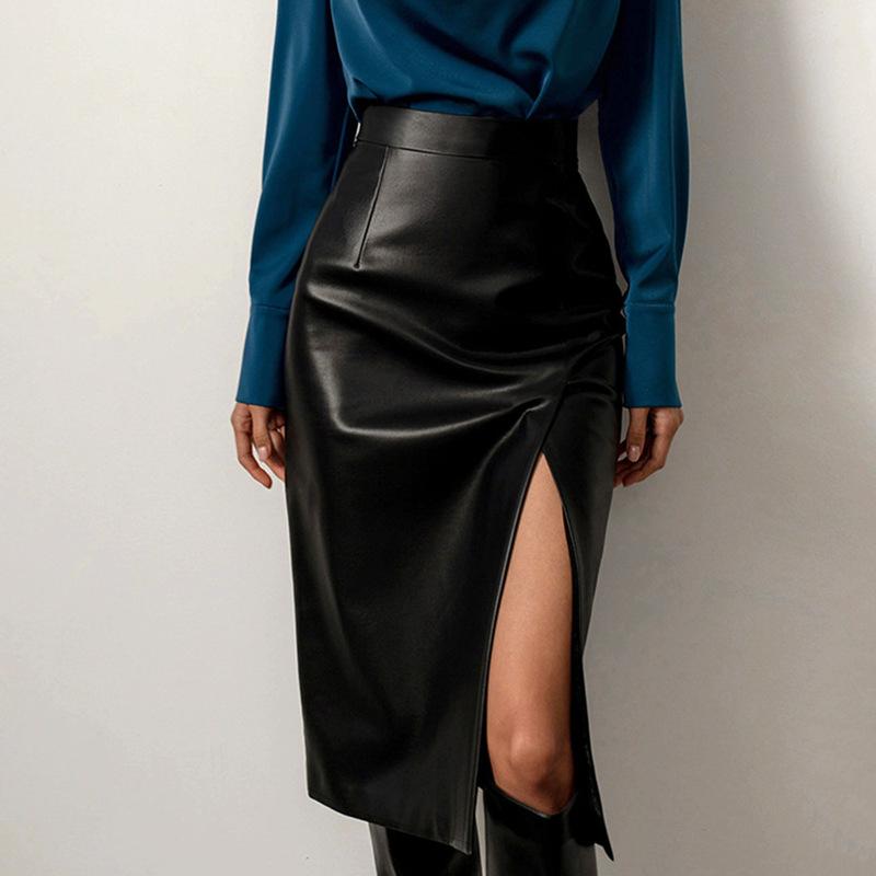 Осень-зима 2023, тонкая юбка из искусственной кожи с разрезом, повседневная черная сексуальная юбка, модная юбка с высокой талией и запахом, женская одежда 28676