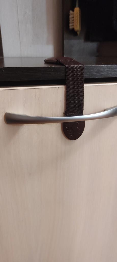 Купила, чтобы закрыть некоторые дверки от кота😆. От открывает просто всё!!! Подобрала в цвет мебели. Крепится легко, держит вроде хорошо!