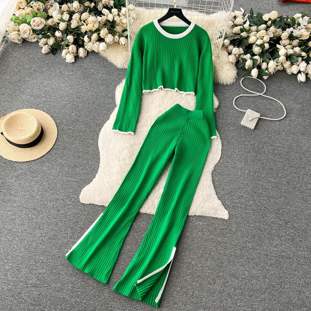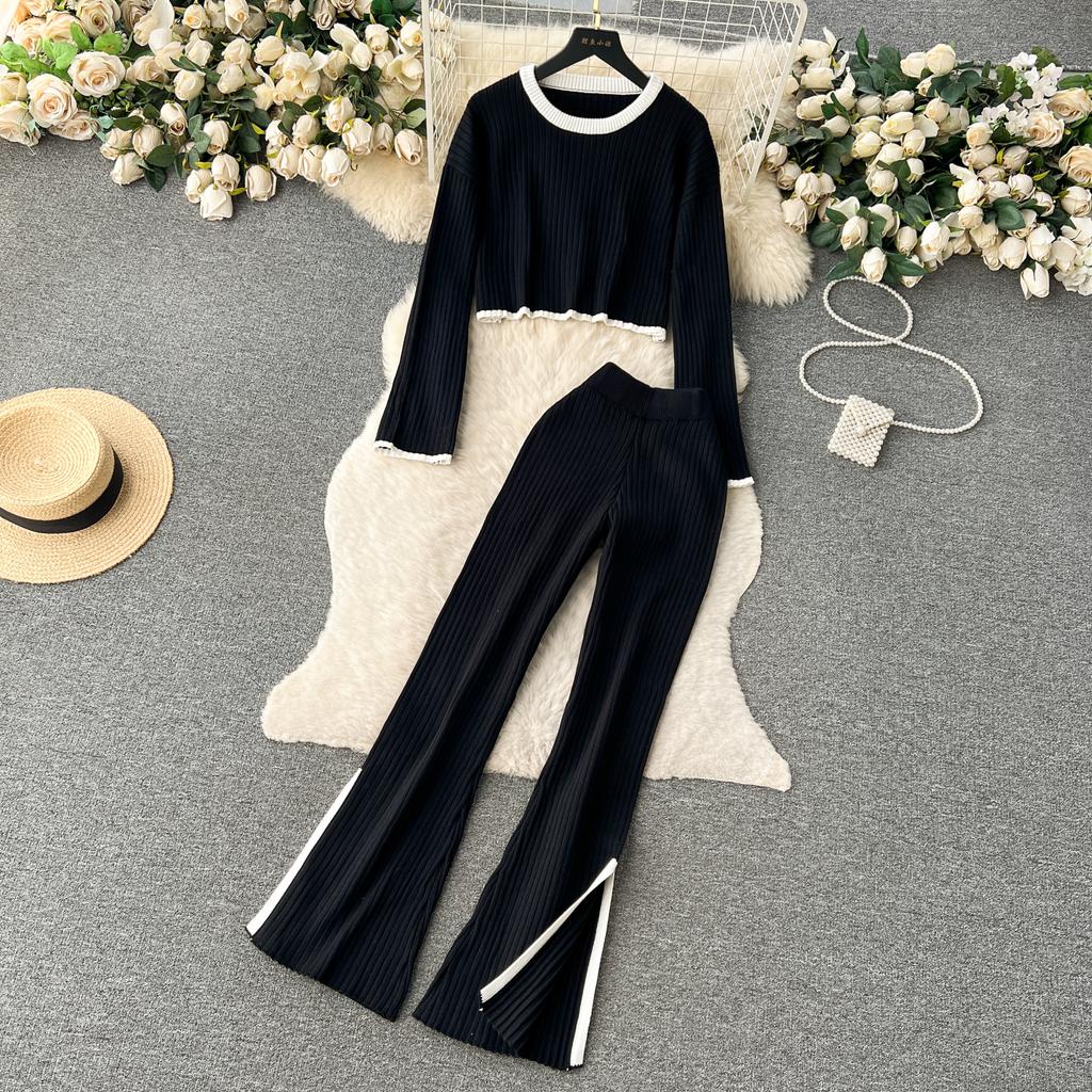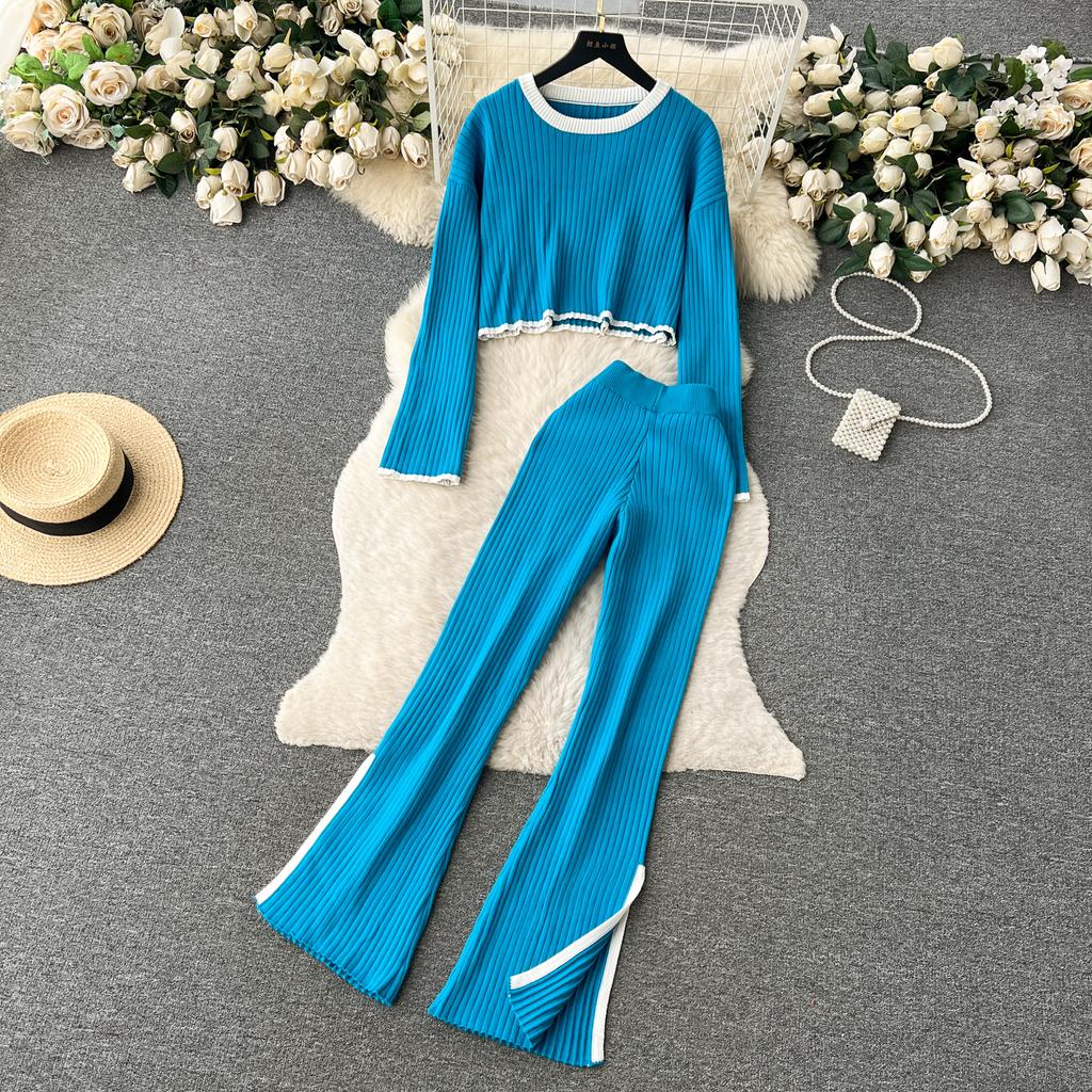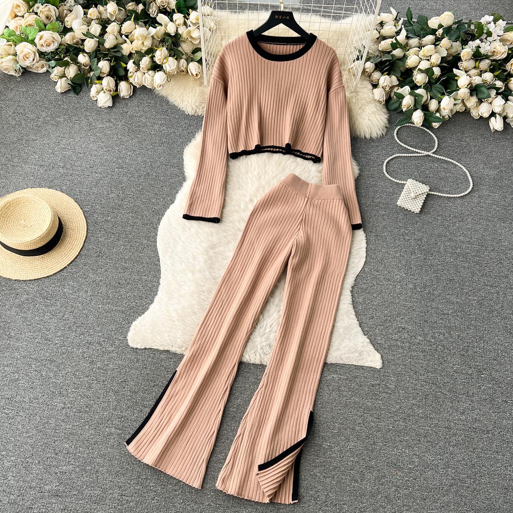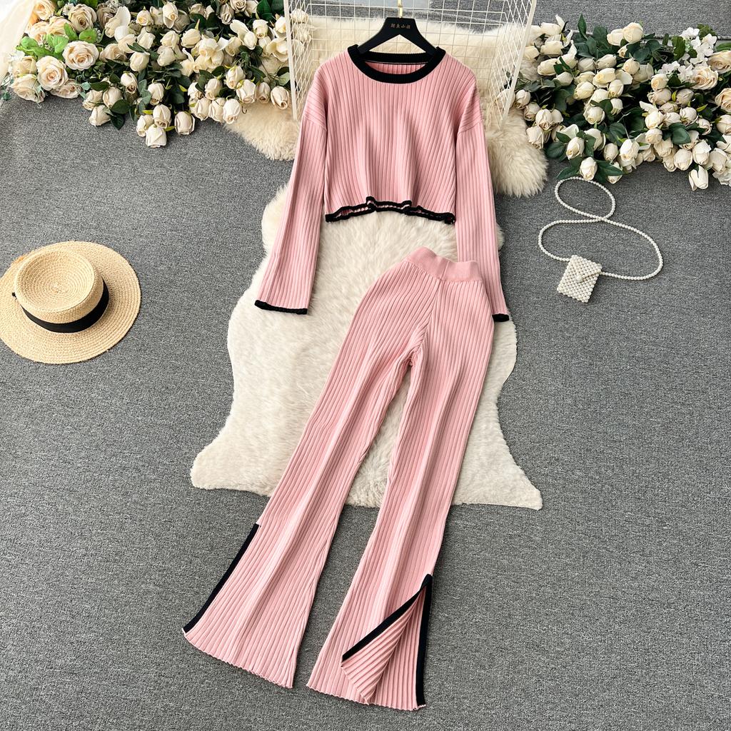 Винтажный вязаный топ с круглым вырезом в стиле Хепберн, короткий топ с длинными рукавами + тонкие драпированные брюки с высокой талией и разрезом, осенне-зимний костюм