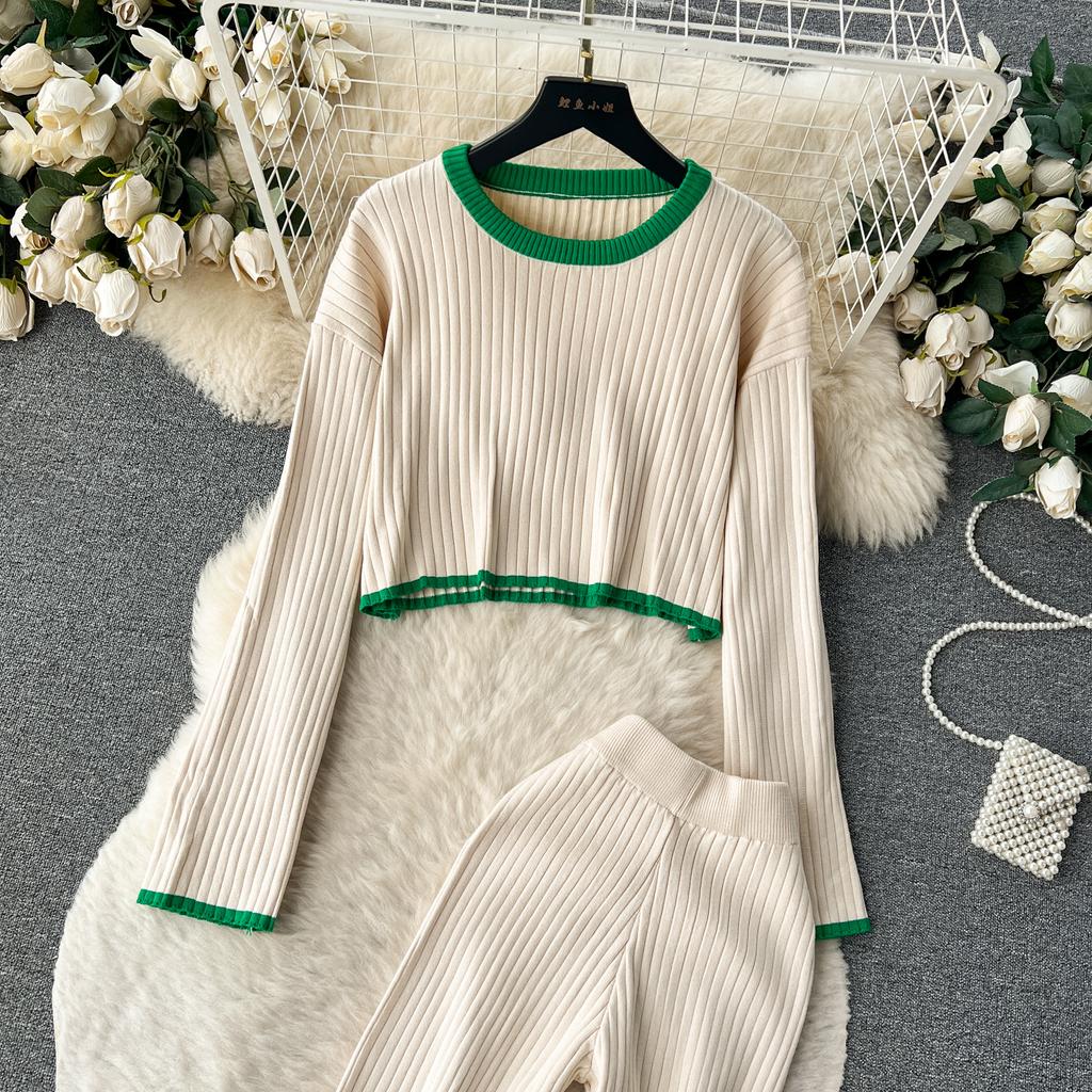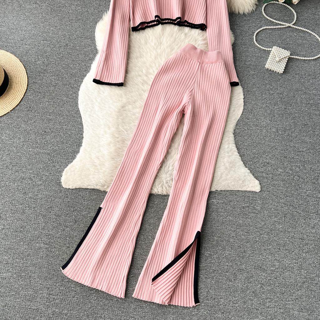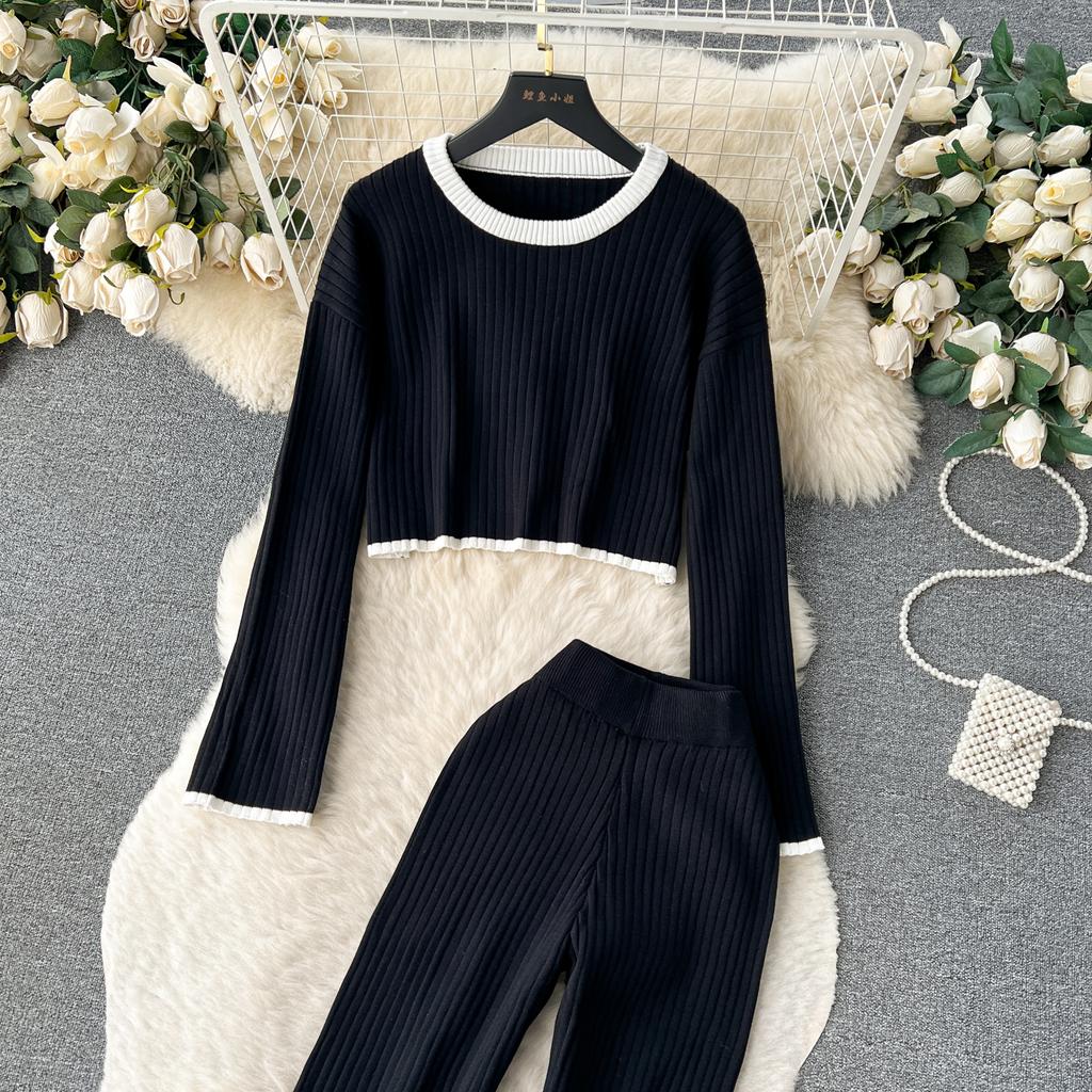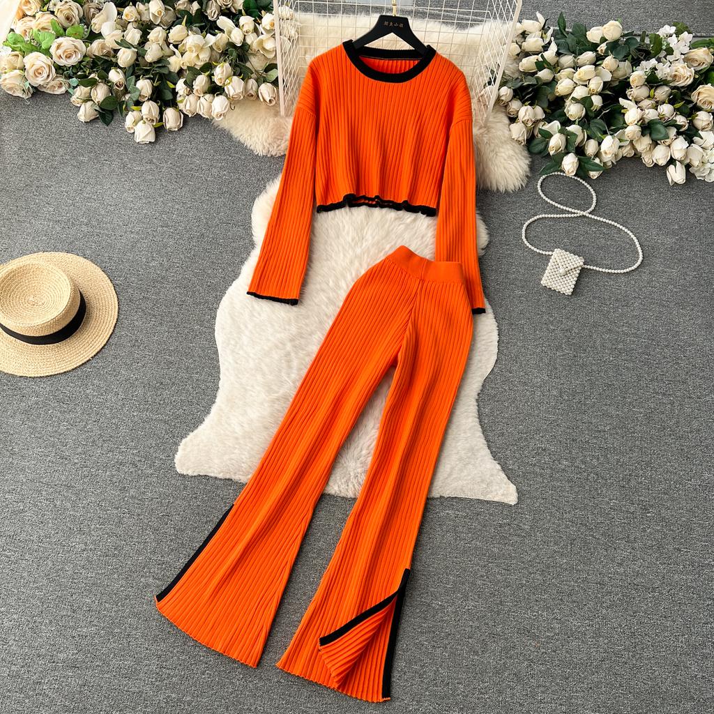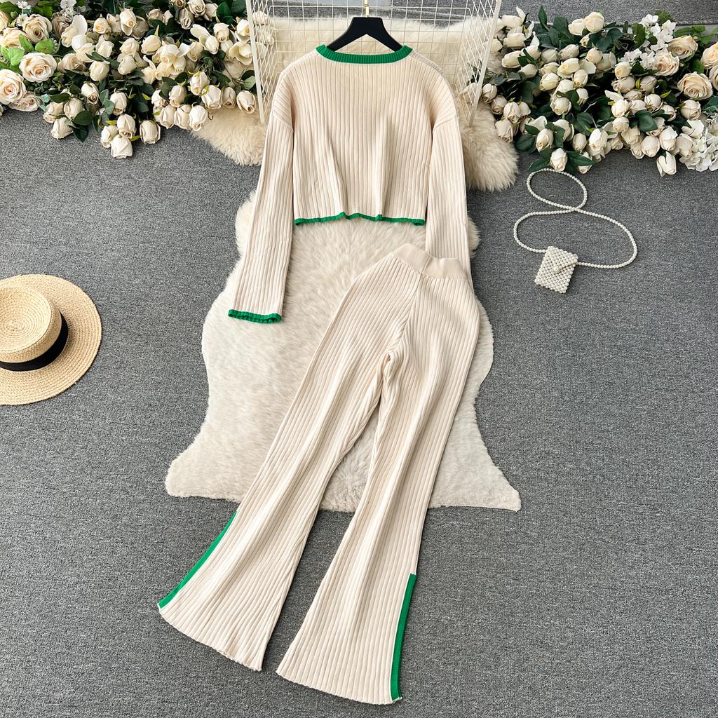 Винтажный вязаный топ с круглым вырезом в стиле Хепберн, короткий топ с длинными рукавами + тонкие драпированные брюки с высокой талией и разрезом, осенне-зимний костюм