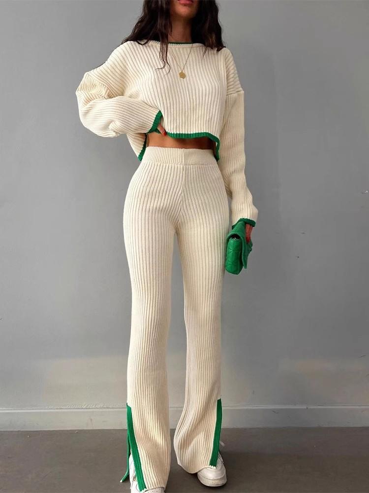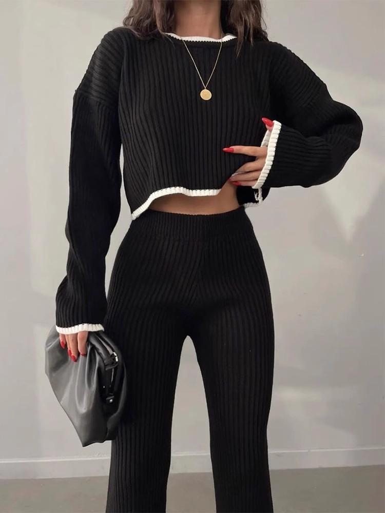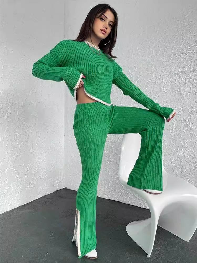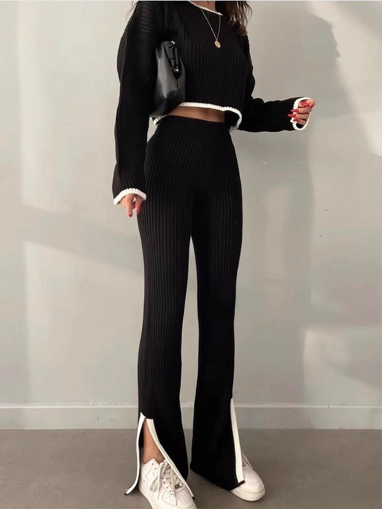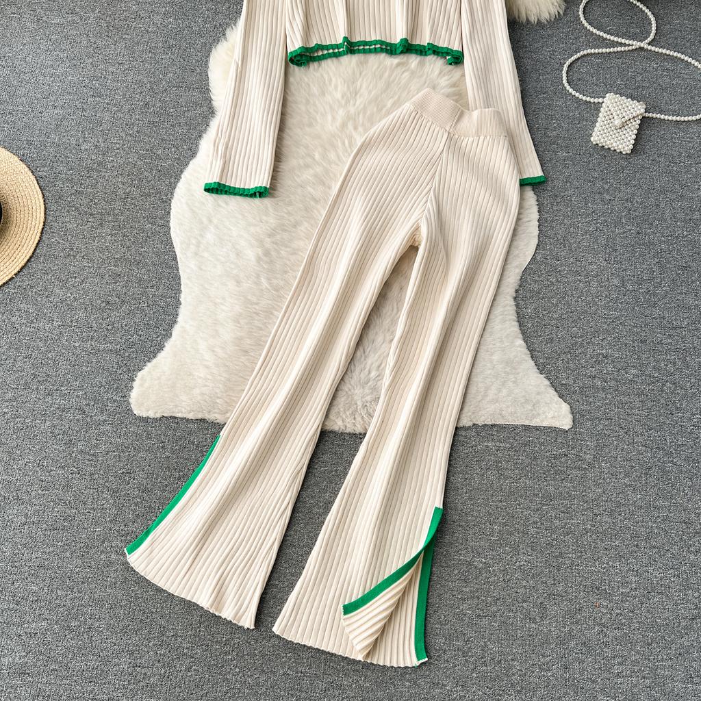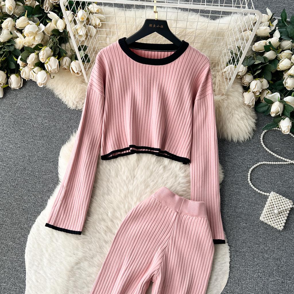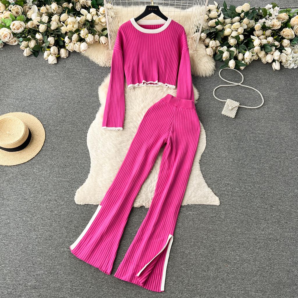Винтажный вязаный топ с круглым вырезом в стиле Хепберн, короткий топ с длинными рукавами + тонкие драпированные брюки с высокой талией и разрезом, осенне-зимний костюм