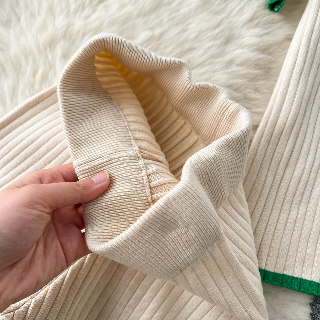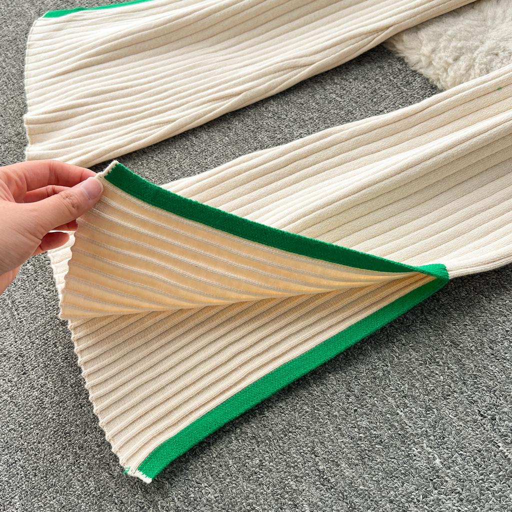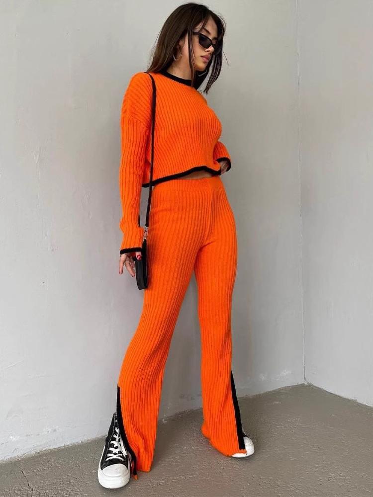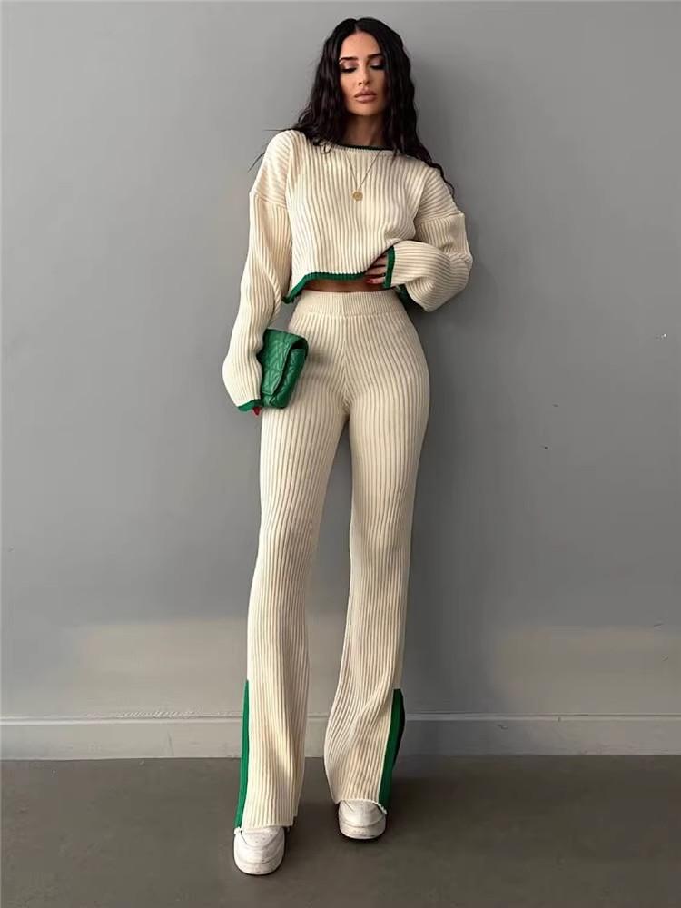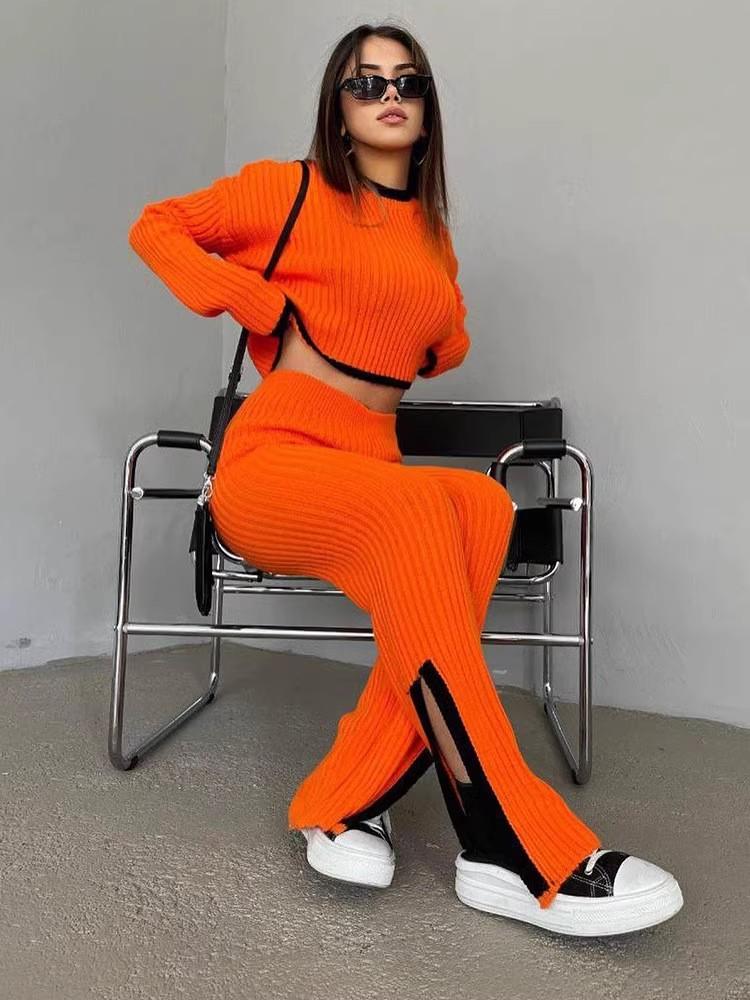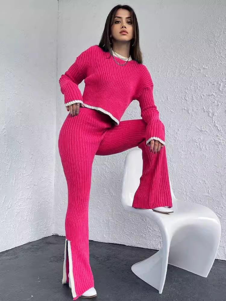Винтажный вязаный топ с круглым вырезом в стиле Хепберн, короткий топ с длинными рукавами + тонкие драпированные брюки с высокой талией и разрезом, осенне-зимний костюм