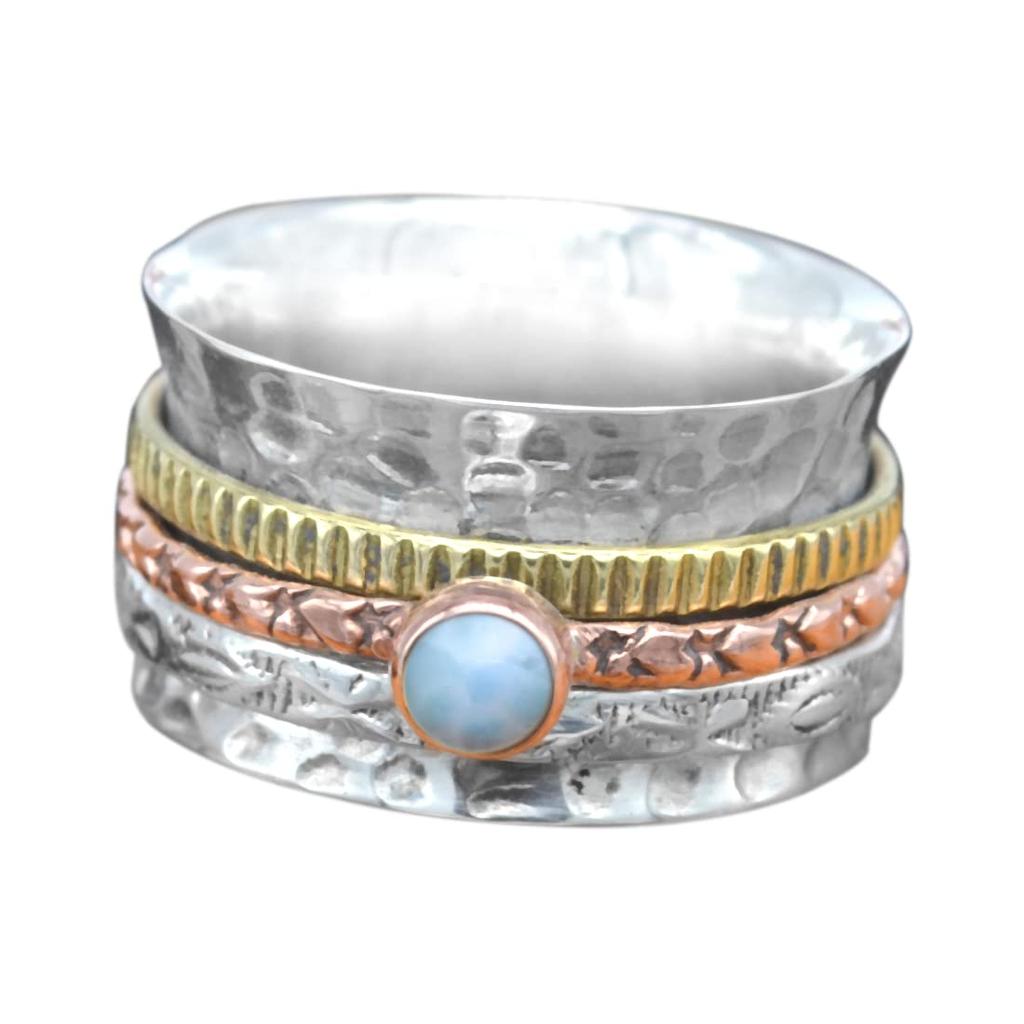 Твердое кольцо из стерлингового серебра 925 пробы с драгоценным камнем ларимар, ювелирные изделия ручной работы, трехцветное кольцо, кольцо-спиннер, ювелирные изделия в стиле бохо
