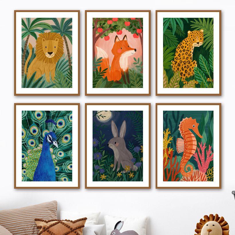 Тропические джунгли Лев Лиса Леопард Кролик Павлин Детская Настенная живопись Печать на холсте Картина на скандинавскую тему Плакат Декор Фотографии Детская комната