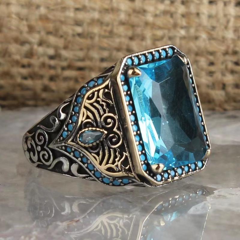 Ретро кольца ручной работы в стиле панк для мужчин, модные серебряные металлические квадратные кольца с инкрустацией зеленого циркона, ювелирные изделия