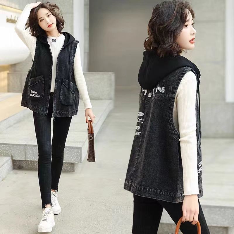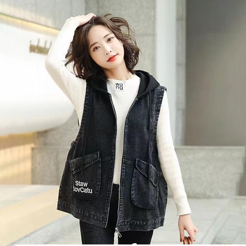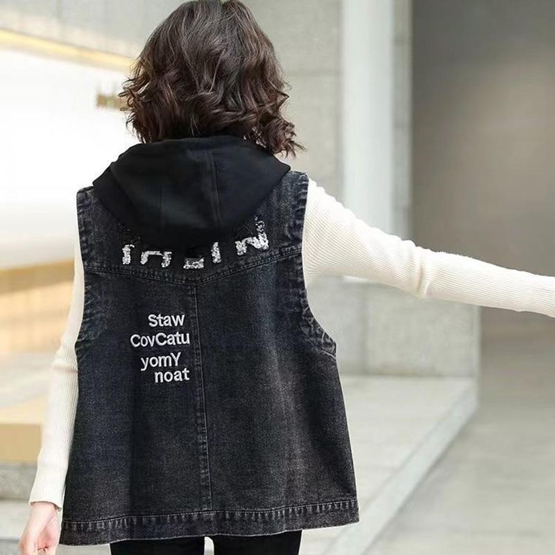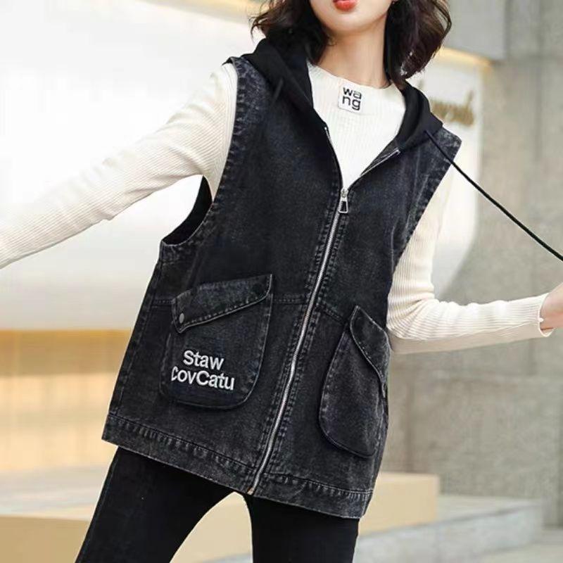 Новый весенне-осенний однотонный джинсовый жилет без рукавов, пальто, куртки, ковбойский жилет, женский повседневный джинсовый жилет с капюшоном, куртка