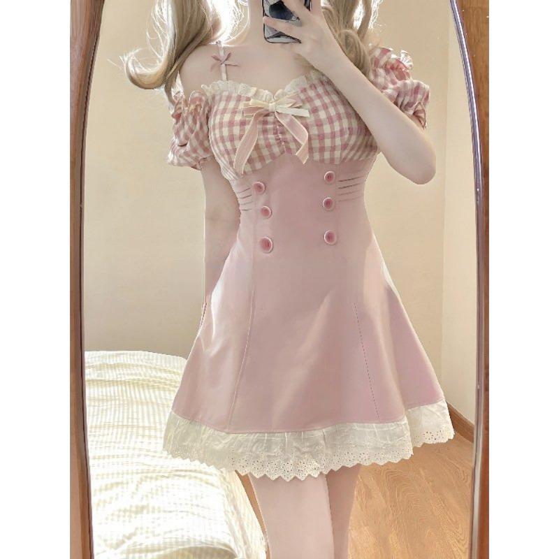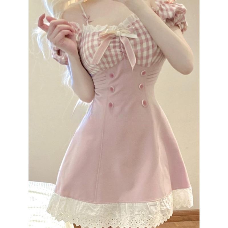 Милое розовое клетчатое платье принцессы с бантом, женское сексуальное платье с разрезом на шее и кружевом с рюшами, вечерние мини-платья, женское тонкое платье Лолиты в японском стиле