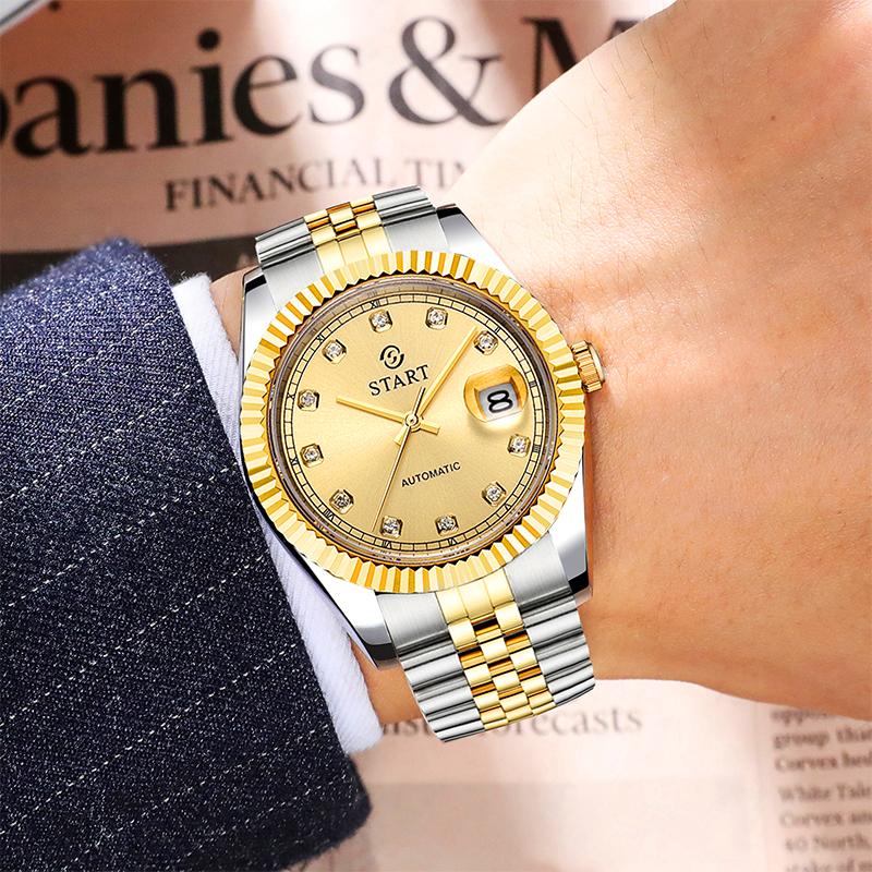 Start Мужские часы с бриллиантовым циферблатом, автоматические механические часы, водонепроницаемые часы с функцией календаря, золотые часы