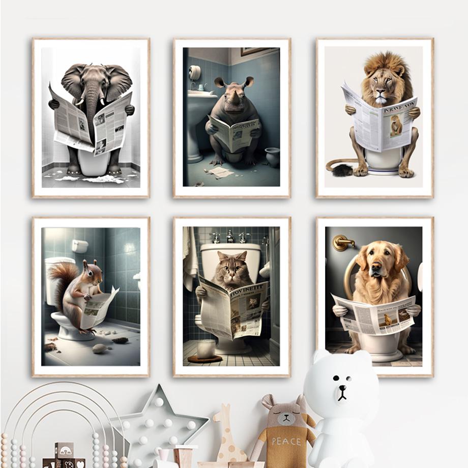 Забавный декор для ванной комнаты, животные, сидящие на унитазе и читающие газетный постер, слон, лев, носорог, художественный принт, холст, живопись