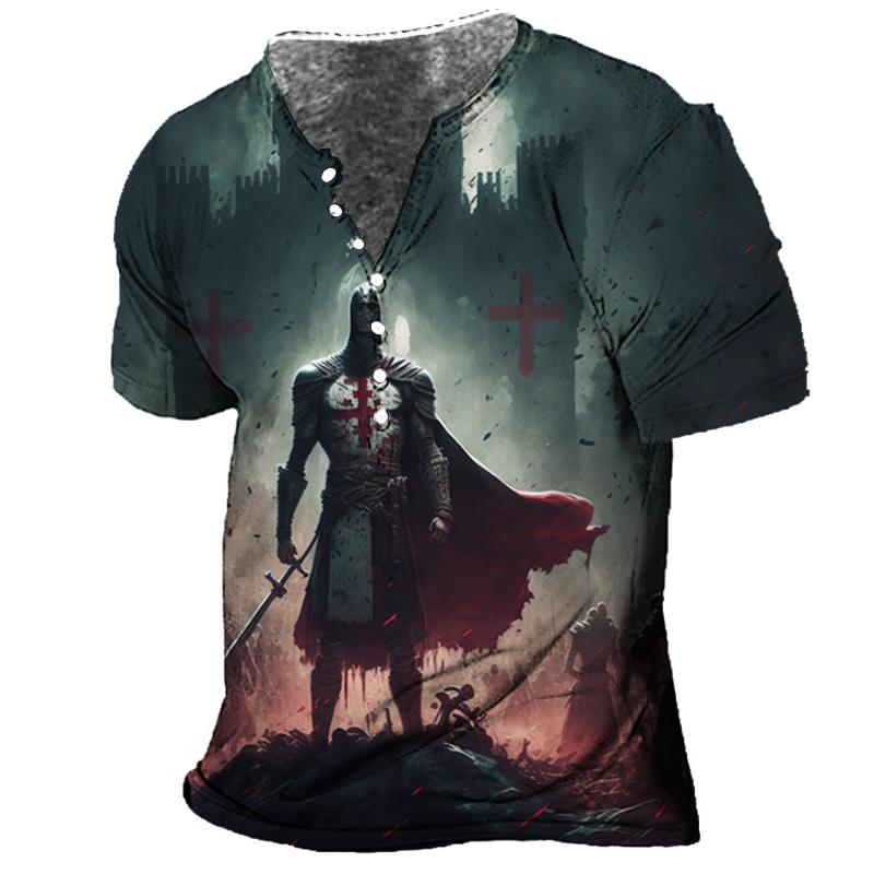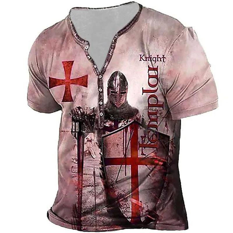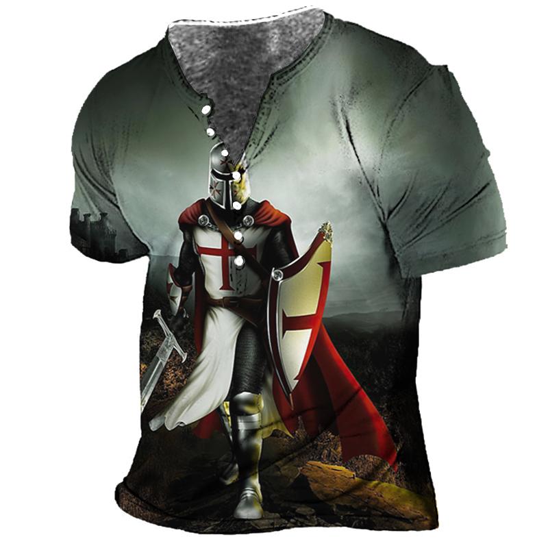Винтажная мужская футболка с 3D принтом, рыцарская рубашка на пуговицах с v-образным вырезом и короткими рукавами, большие топы, футболка, мужская одежда, уличная одежда