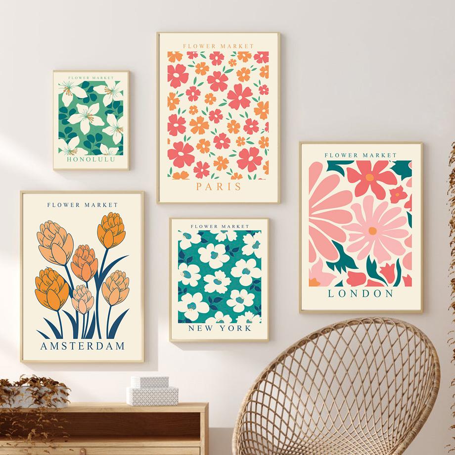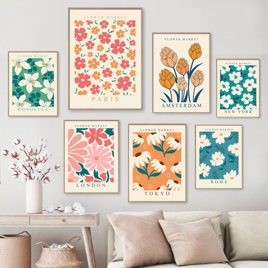 Плакат с цветочным рынком Париж, Лондон, Нью-Йорк, ботанический цветочный рисунок, настенная живопись, печать на холсте, современная гостиная, домашний декор