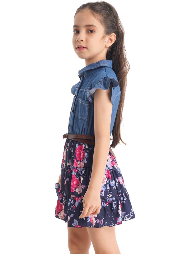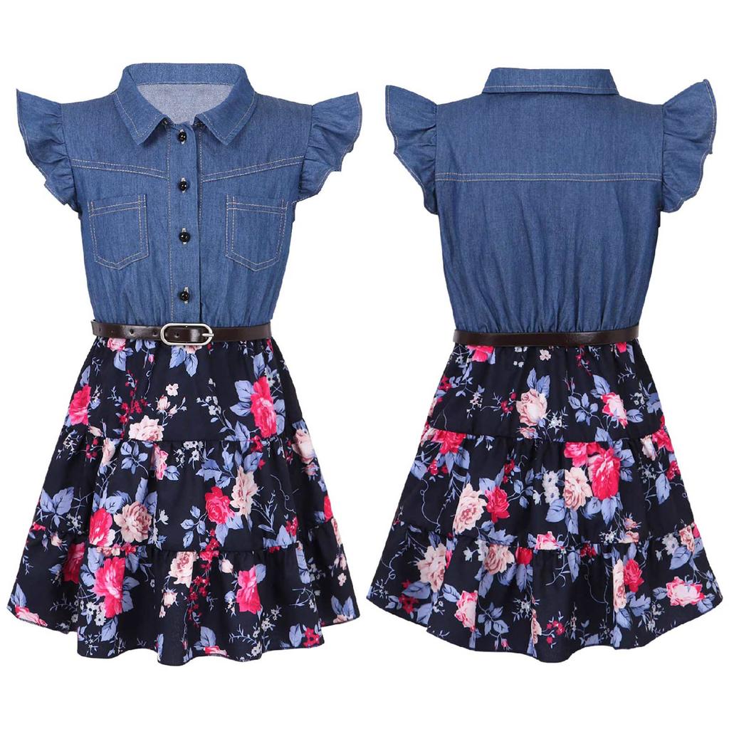 Платья для девочек Джинсовая распашная юбка с цветочным принтом и поясом Модная повседневная одежда для девочек