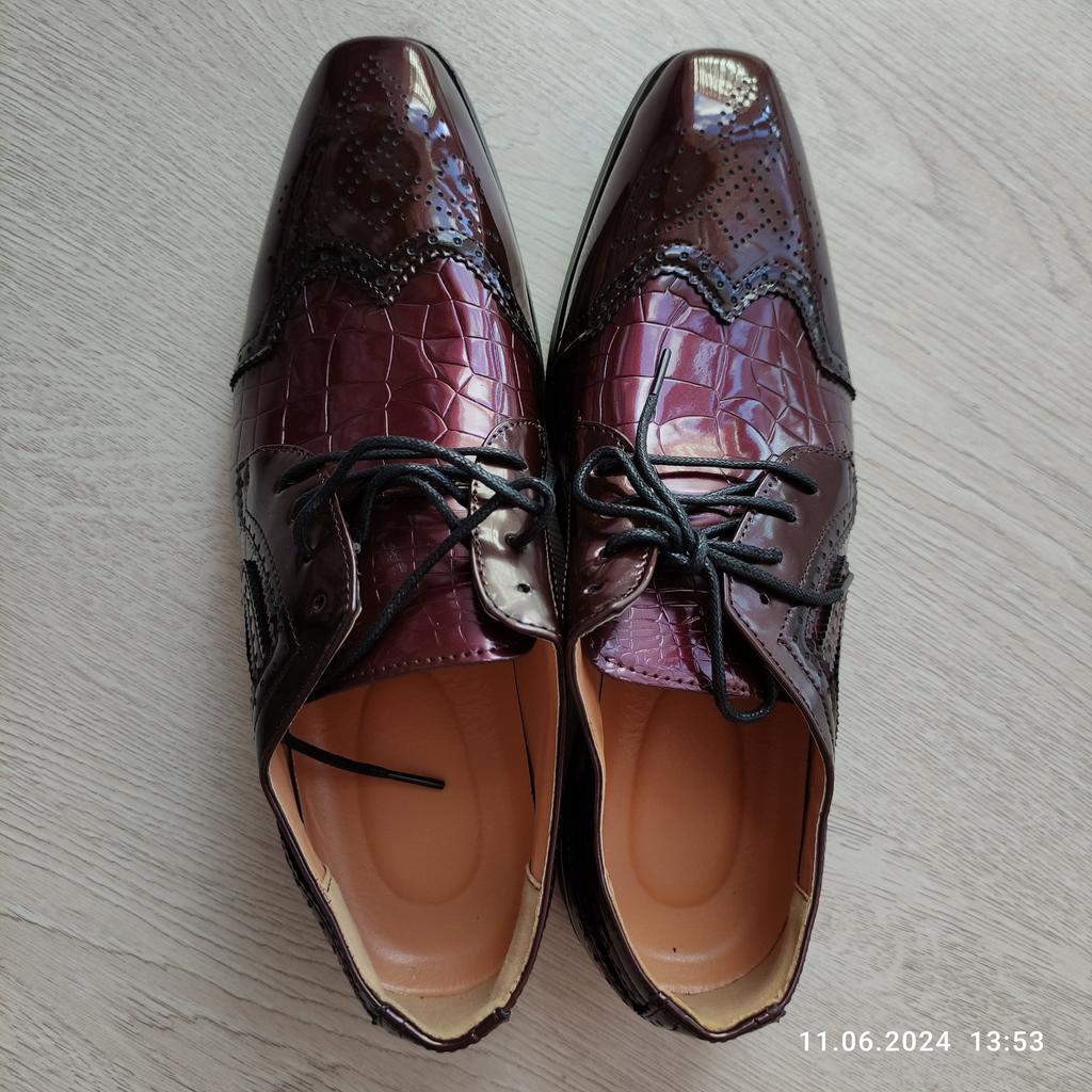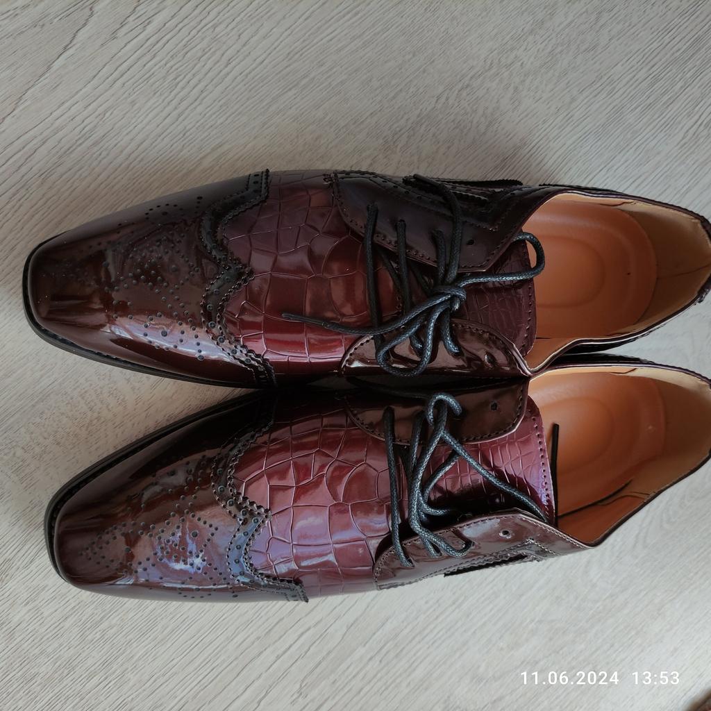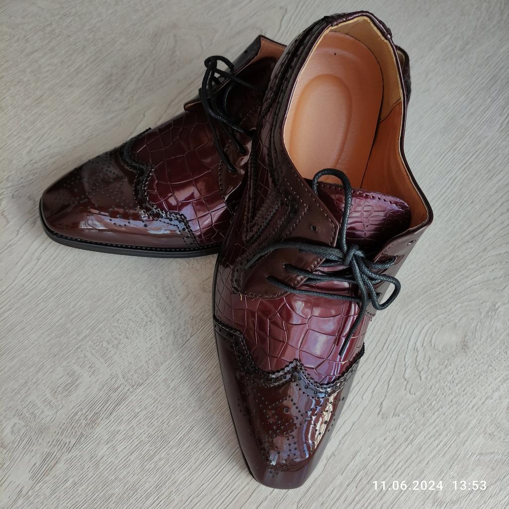 Туфли пришли в течение месяца. Сшиты не плохо, брал для сцены на выступления. Конечно это не крокодил, но смотрятся не плохо. Размер 41 взял, чуть больше ват, но положу стельку и будет замечательно, так как у меня длина стопы 25 см, а 40 от 24.6-25, вдруг был бы чуть малой и давил, поэтому взял 41 ый. Продавца рекомендую.
