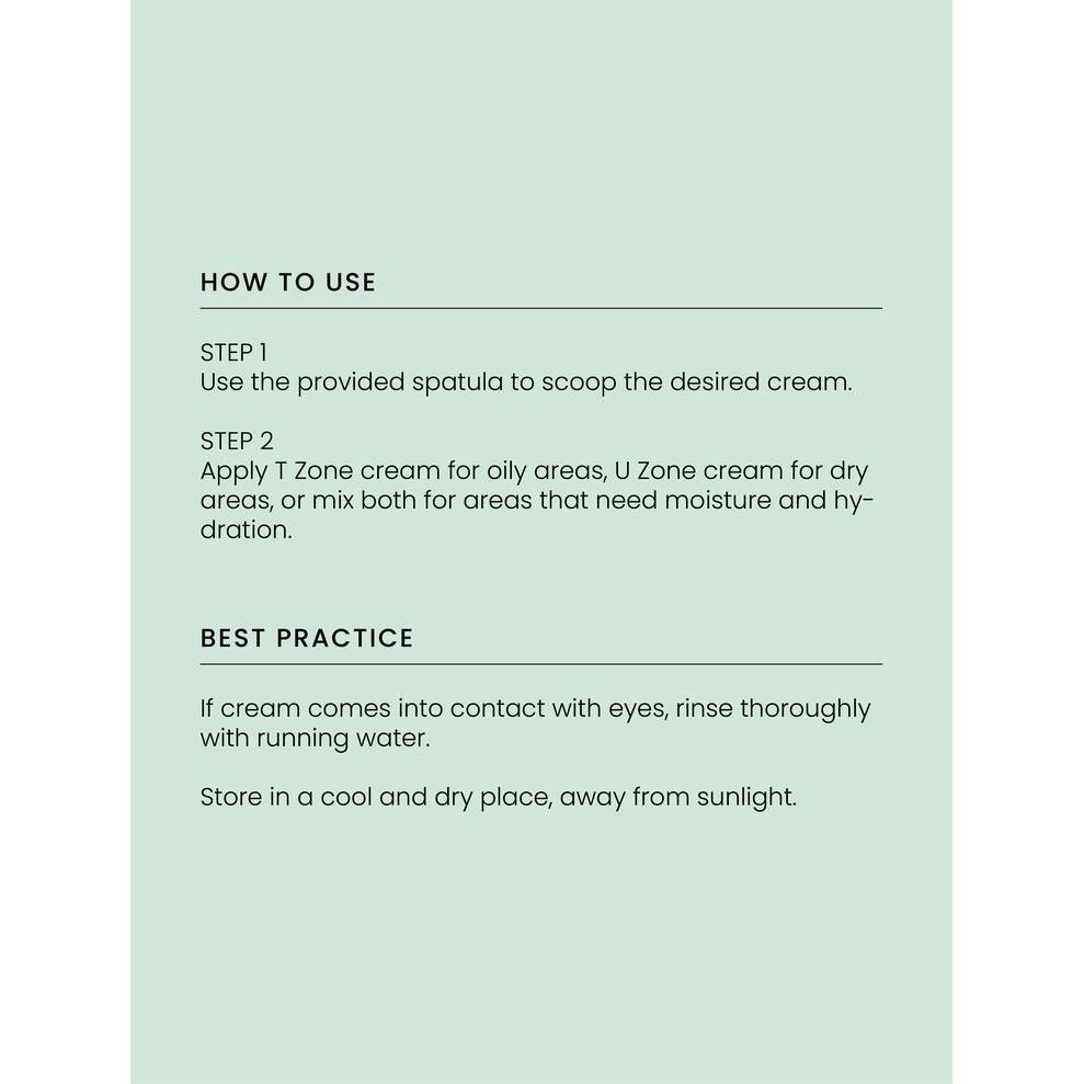 Для более сухих участков нанесите крем U Zone.. Для более жирных участков нанесите крем для Т-зоны.. Если вам нужно дополнительное увлажнение и увлажнение, вы также можете смешать оба крема вместе.