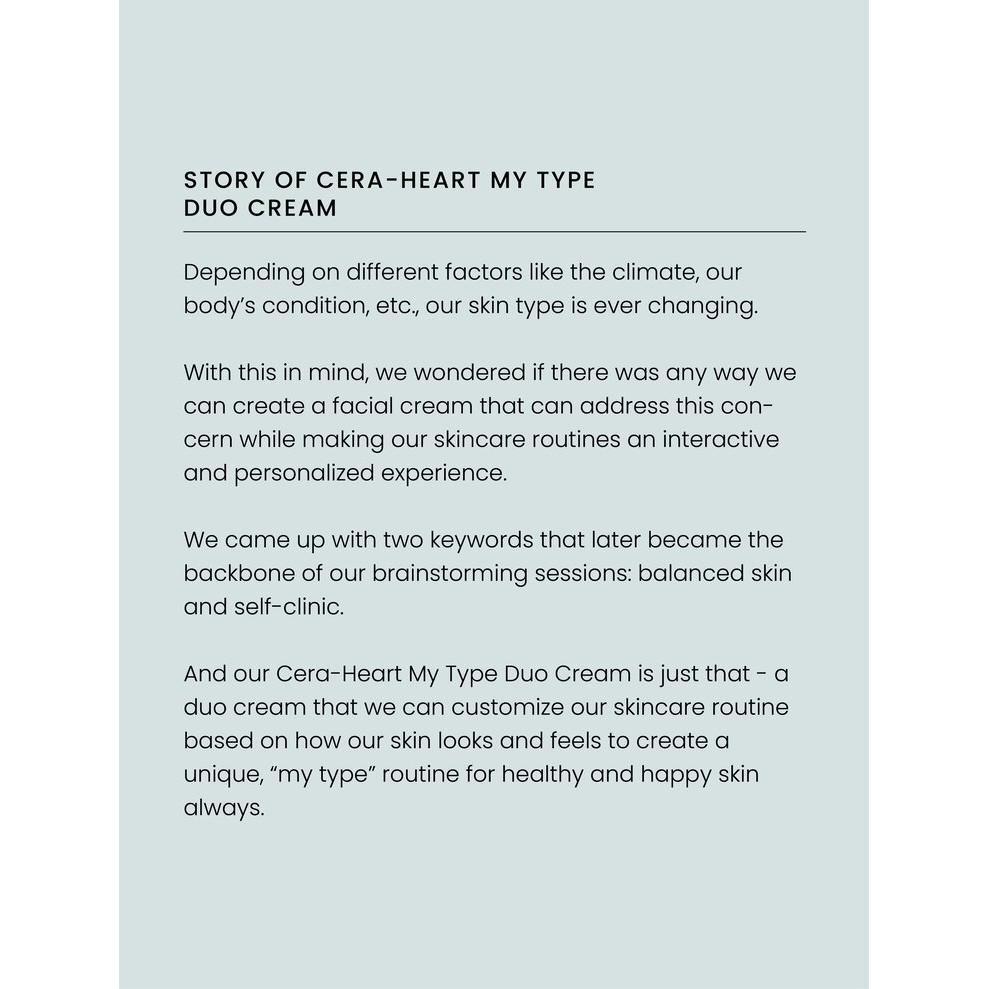 AXIS-Y Cera-Heart My Type Duo Cream — это идеальная команда мечты, которая создаст идеальный увлажняющий крем для вашего состояния кожи независимо от сезона.. В жаркие дни, когда ваша кожа становится более жирной, наносите больше крема для Т-зоны.; в холодные зимние месяцы наносите больше крема для U-зоны.. Крем для Т-зоны имеет гелевую текстуру, которая увлажняет жирные участки кожи, помогает контролировать выработку кожного сала и предотвращает повреждение от солнца.. Крем U-Zone имеет кремовую текстуру, которая удерживает влагу и защищает кожу от агрессивного воздействия окружающей среды.. Этот увлажняющий крем 2-в-1 является основным продуктом ухода за кожей круглый год.