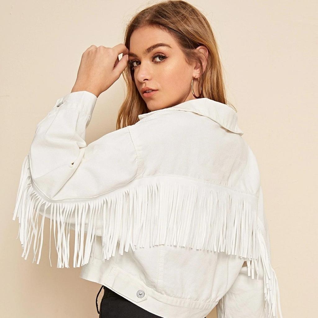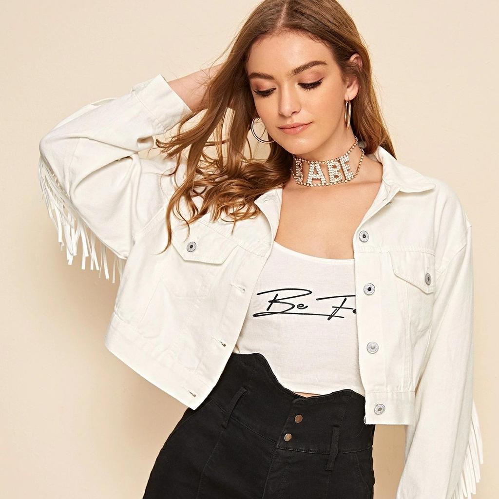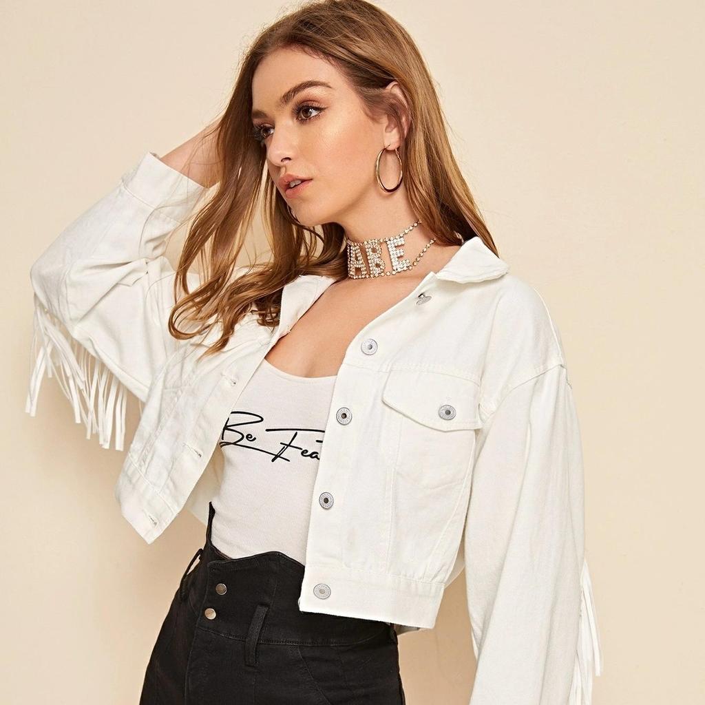 Новая женская джинсовая куртка с кисточками Женская белая куртка облегающая модная джинсовая куртка