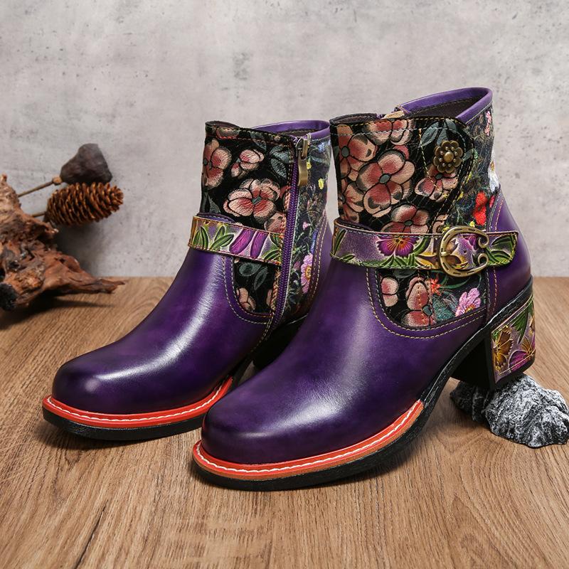 Johnature Винтажные женские сапоги на высоком каблуке с цветочным принтом, туфли из натуральной кожи, модные короткие сапоги с пряжкой на ремне с ручной росписью