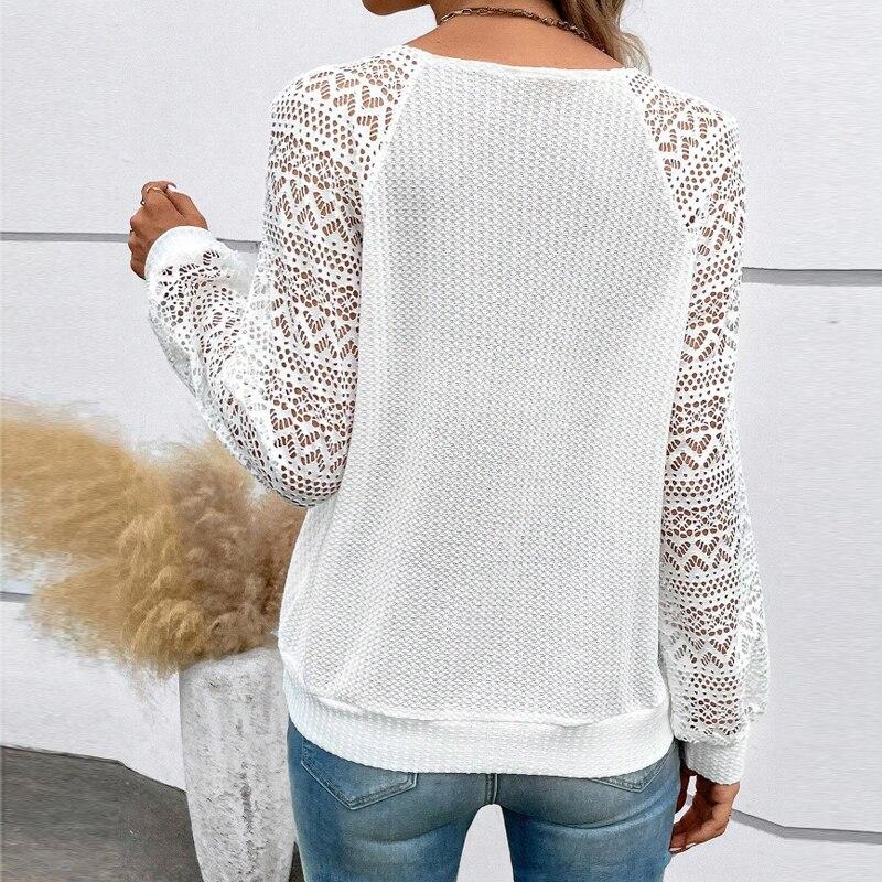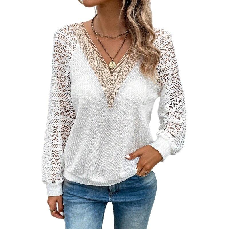 Кружева с v-образным вырезом, элегантная модная блузка, осенняя рубашка с длинным рукавом, сращенная рубашка, блузка, повседневная белая блузка, свободные топы 28410