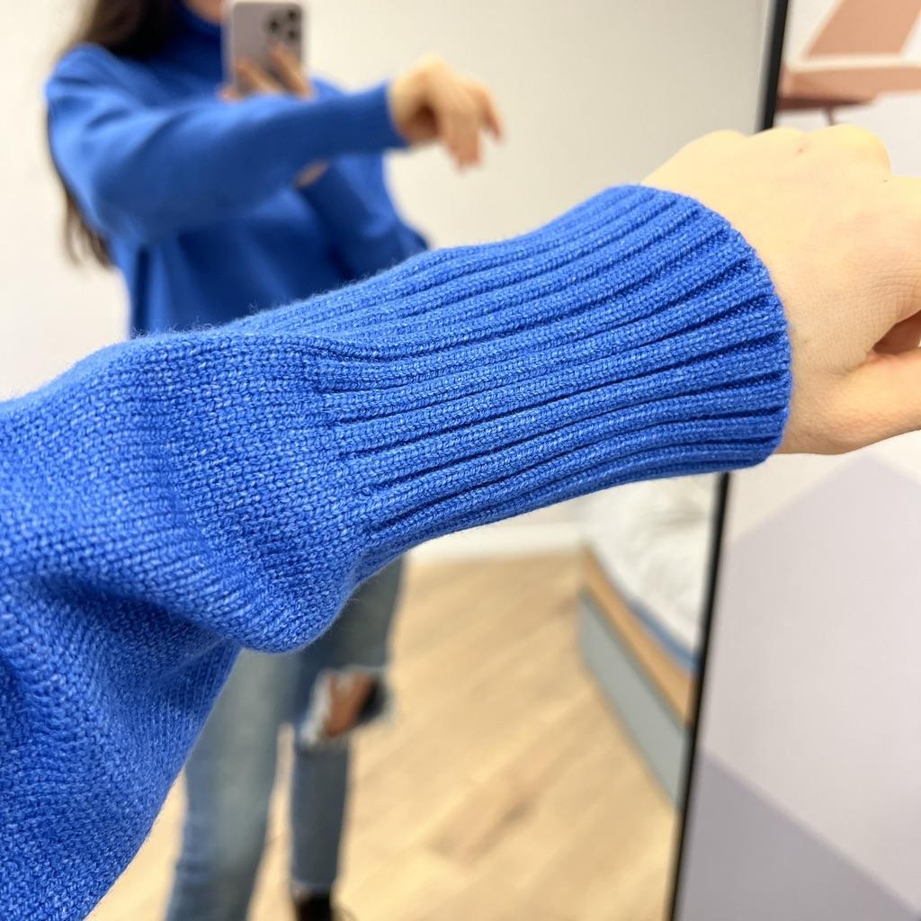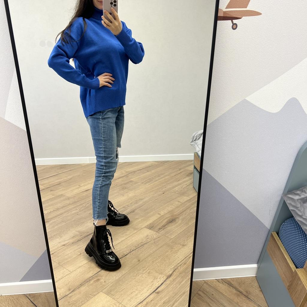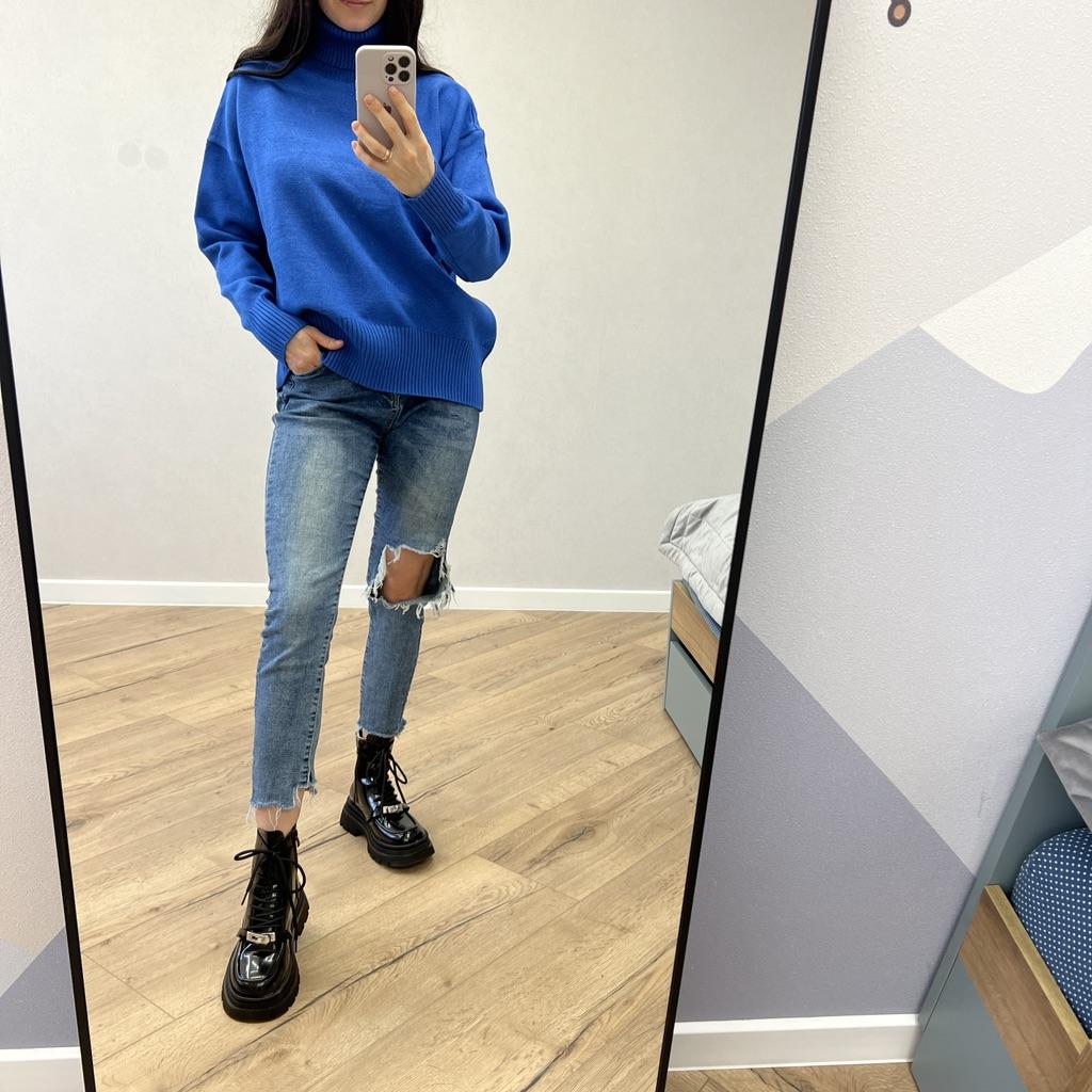 Получила сегодня свитер. Обработка оставляет желать лучшего. Ощущение что детали вырезаны, жутко обработаны, соединение грубое, не ровное. А также соединение сделано на 0,7 мм в плечевом отделе. Ниток несметное количество. Придётся самой обрабатывать чтобы не распустилось полотно. Цена завышена. О самом свитере. Плотная вязка, нитка как меланжевая, заметна добавка нейлоновой нити. Цвет соответствует заказанному. Плечи скошены. На мой 48 размер оверсайз. Запаха нет. Само полотно плотное, гладкое, нежное. Резинка хорошо держит. Горловина гольф. Носить можно, но требуется обработка плечевых отделов с двух сторон, а также рукавов. Спасибо Джум, обратилась в службу поддержки.
