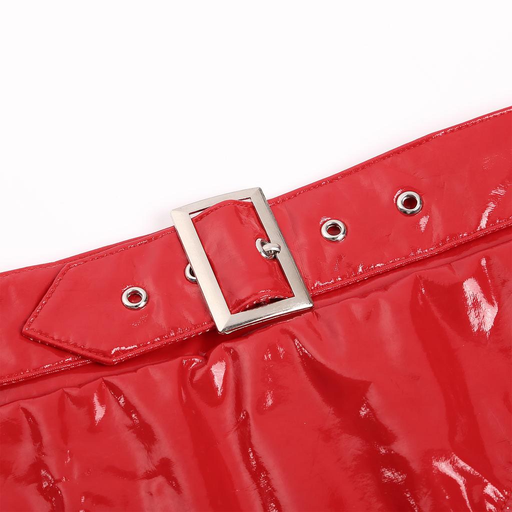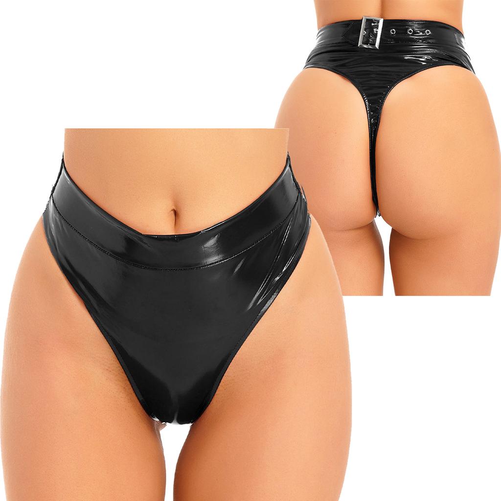 Женские блестящие кожаные трусы из металлизированной кожи, стринги с высоким вырезом, регулируемый ремень с пряжкой, низ