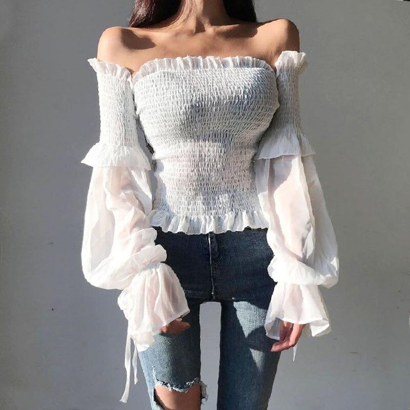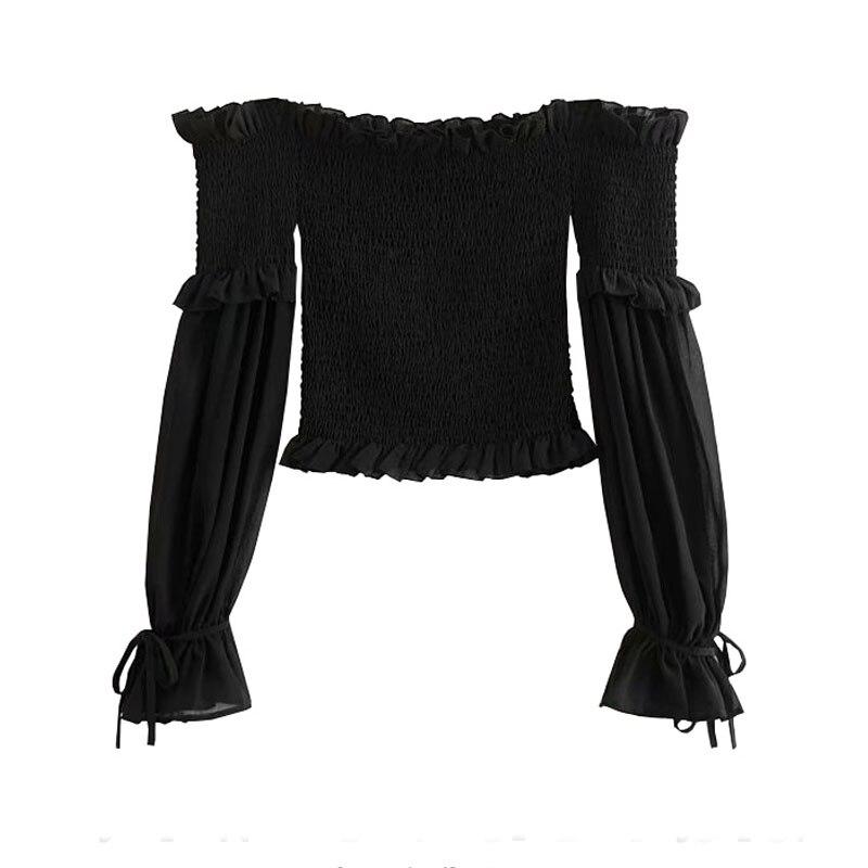 Весенние модные женские укороченные топы с открытыми плечами, однотонные плиссированные блузки с длинными рукавами и бантом, женская рубашка, корсет на шнуровке 12813