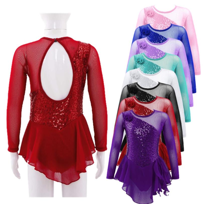Детское платье для фигурного катания с длинными рукавами для девочек, балетное танцевальное гимнастическое трико с сетчатой юбкой, танцевальная одежда, детский костюм для катания на коньках