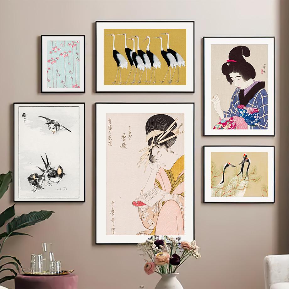 Японский стиль Журавль Ласточка Лебедь Женщина Цветочные постеры и принты Настенная живопись на холсте для гостиной Декоративные фотографии