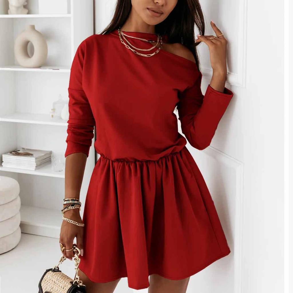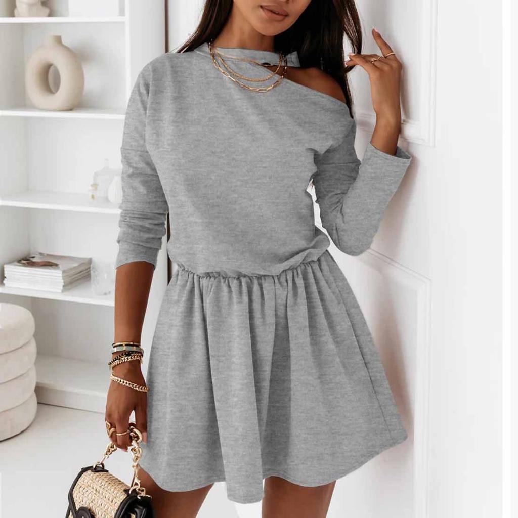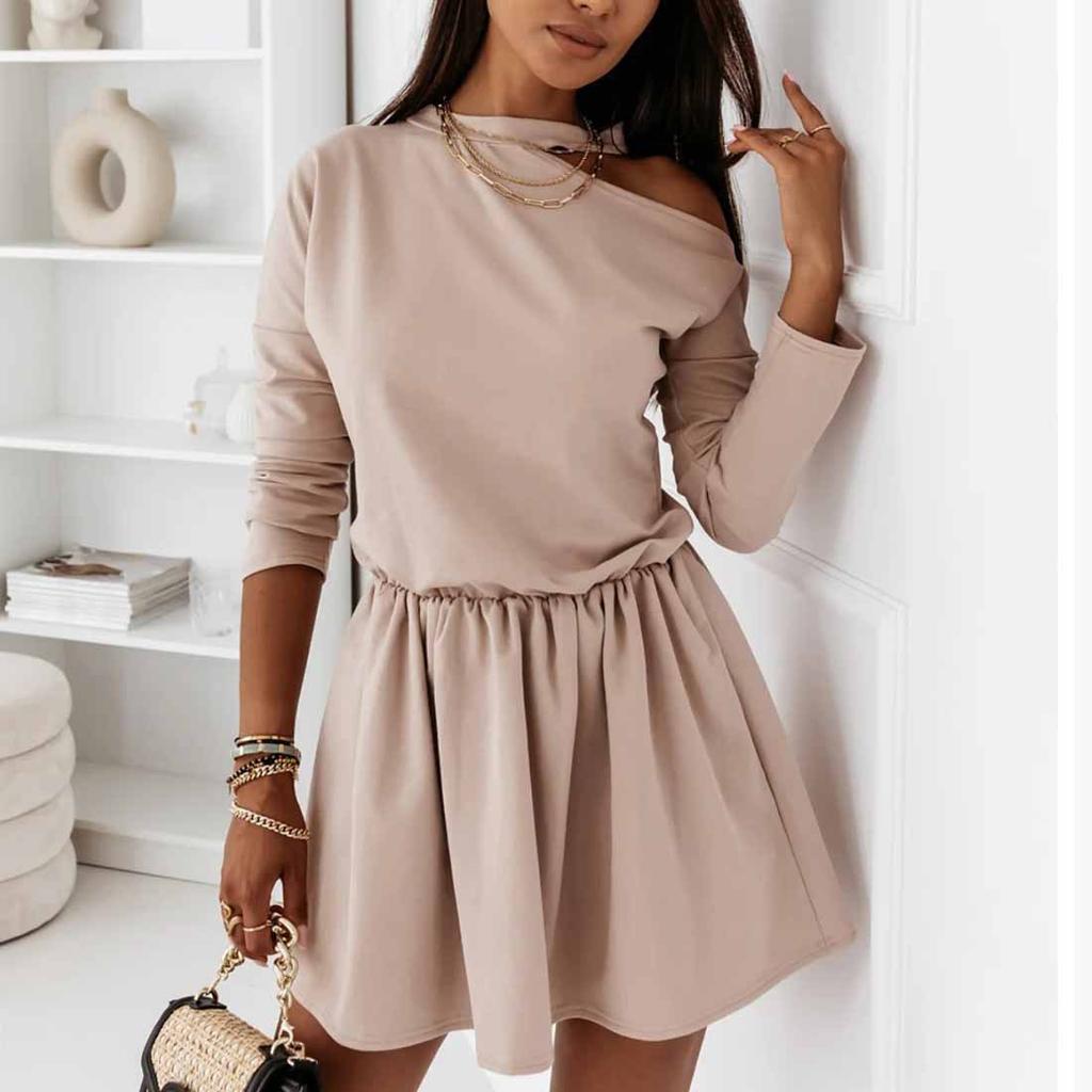 Женская мода с длинным рукавом сплошной цвет собрать талию повседневное мини-платье