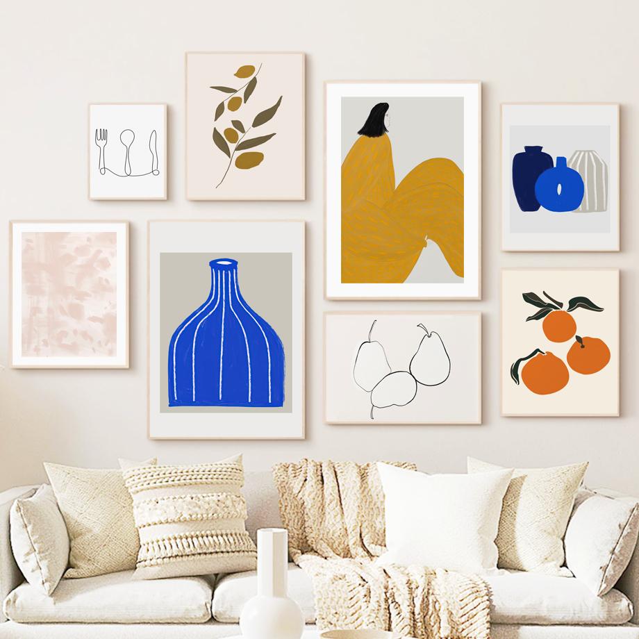 Груши, апельсины, фрукты, листья, столовые приборы, ваза, настенное искусство, печать на холсте, живопись, линии, постеры, рисунок девушки, фотографии для декора гостиной