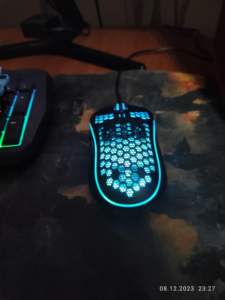 Мышка симпатичная, постоянно подсвечивается разными цветами в планом режиме, не навязчиво и красиво, в руке удобно ложится. Лёгкая но это не мешает играть. Отзывается на движение отлично. За такую стоимость отличная игравая мышка)) продавцу спасибо.